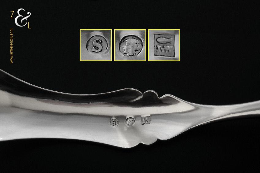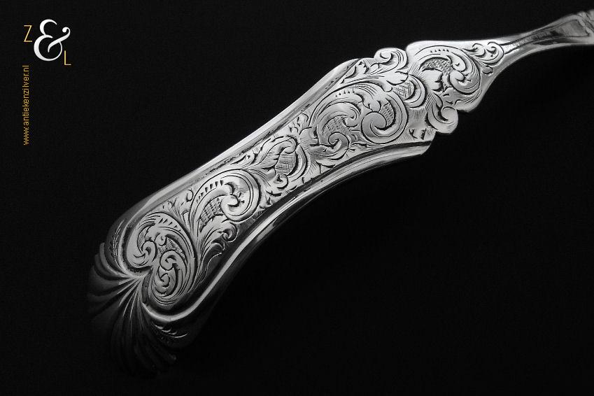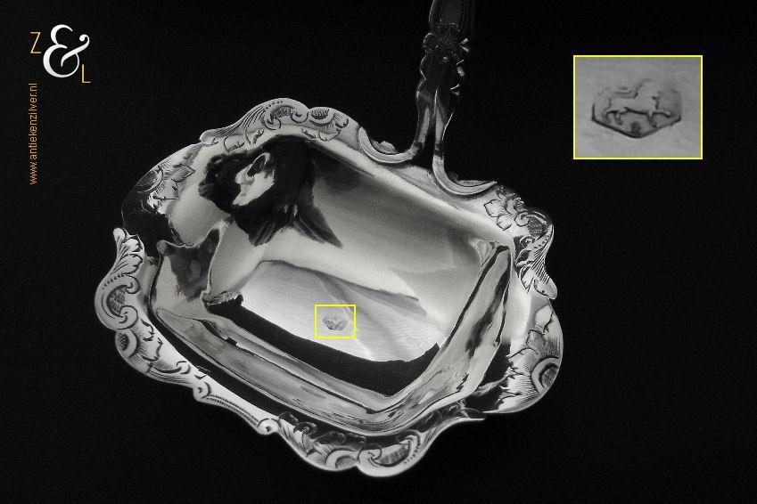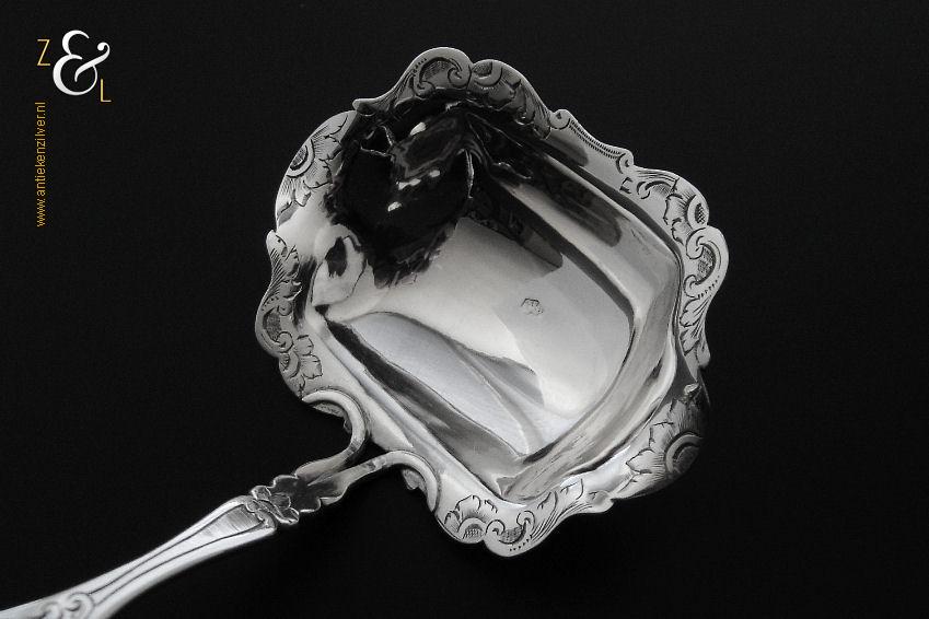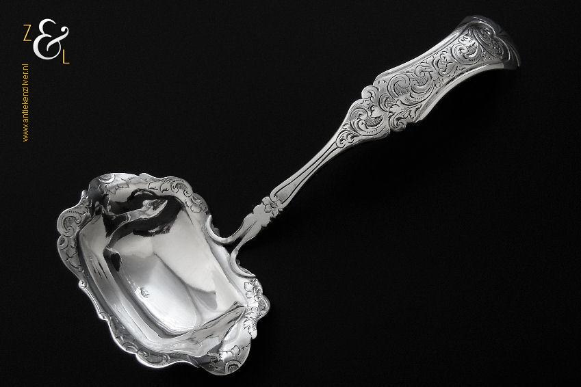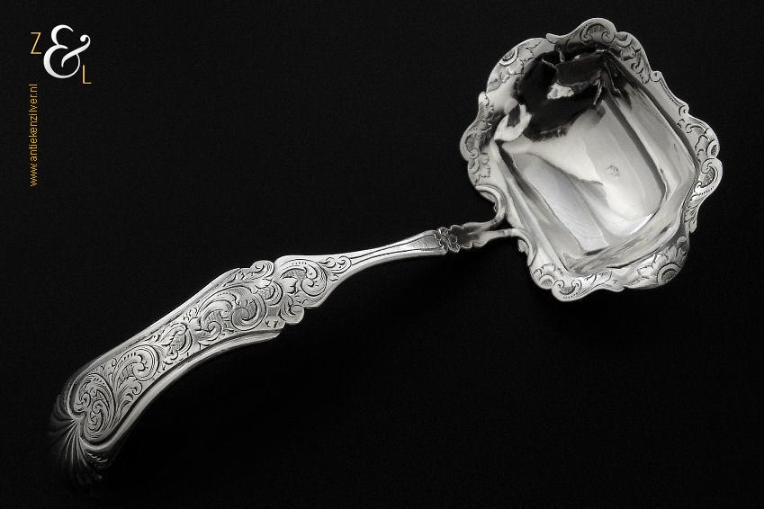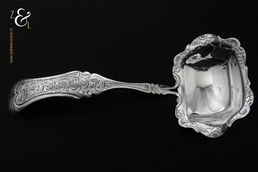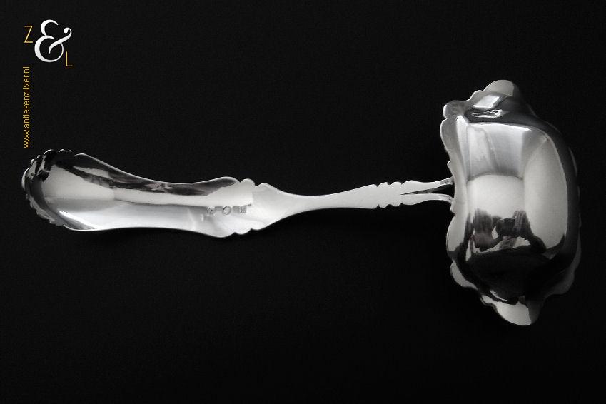 Deze sauslepel is gemaakt in Amsterdam door Jacob van Wijk jr. (meesterteken JvW onder vis in vierkant) in het jaar 1852 (jaarletter S). De zilveren Biedermeier sauslepel heeft een gecontourneerde lepelbak die gegraveerd is met bloemmotieven en c-vormige voluten. De steel en handvat hebben een diepe gravering van c-vormige voluten. Tevens is het uiteinde van het handvat uitgevoerd met een schelpmotief. De sauslepel weegt 52 gram en is 17.2 cm lang. De rechthoekige lepelbak is 7.5 cm lang bij 5.6 cm breed.