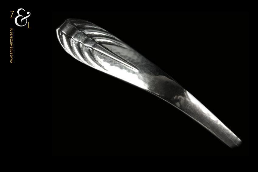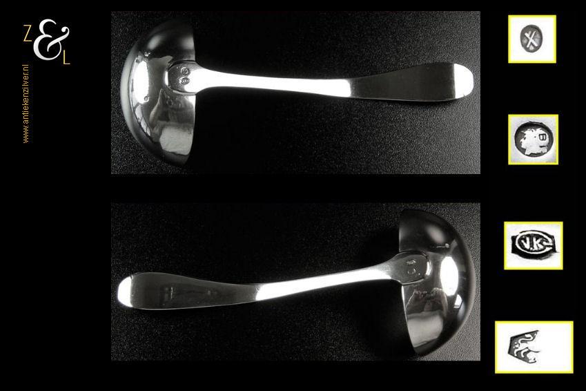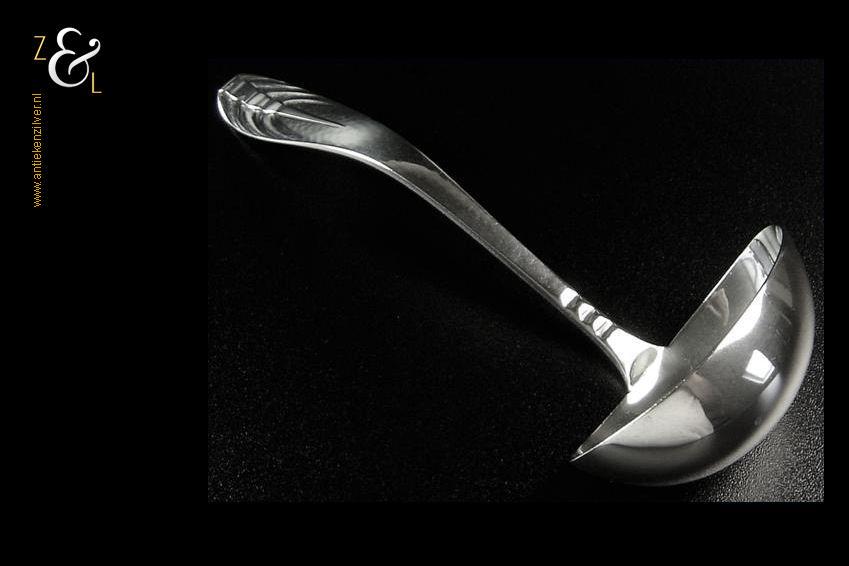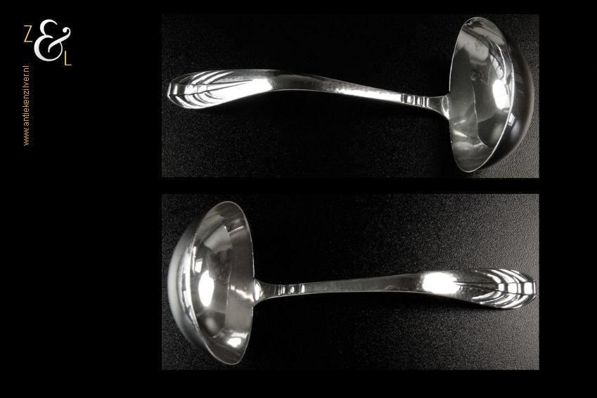 Sauslepel model 204 ontwerp H.J. Valk gemaakt in Zeist door Gerritsen & van Kempen N.V. (meesterteken V.K. in G) in het jaar 1932 (jaarletter X). Deze zware zilveren sauslepel met gehamerde steel in Amsterdamse School stijl weegt 70 gram is 16.8 cm lang en de bak meet 7.2 cm bij 4.6 cm.
