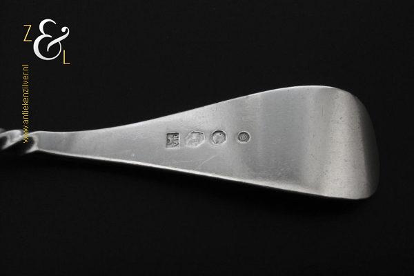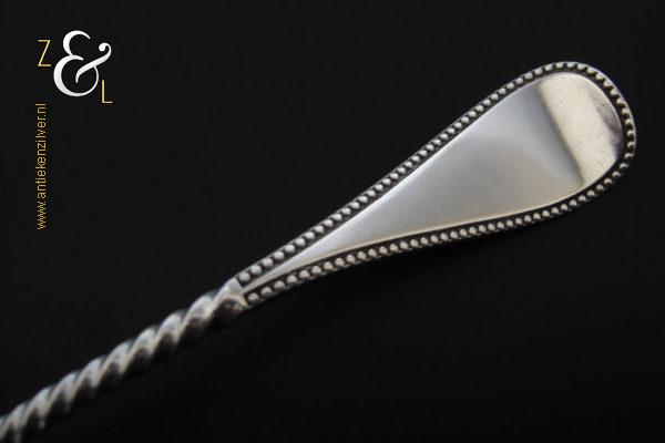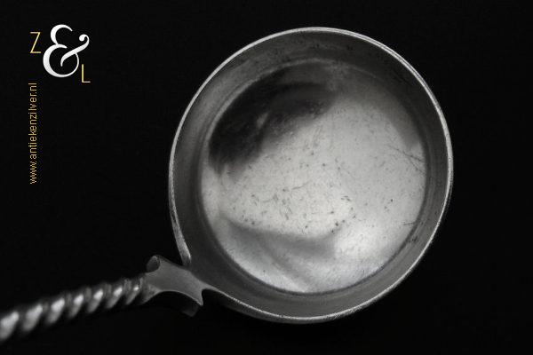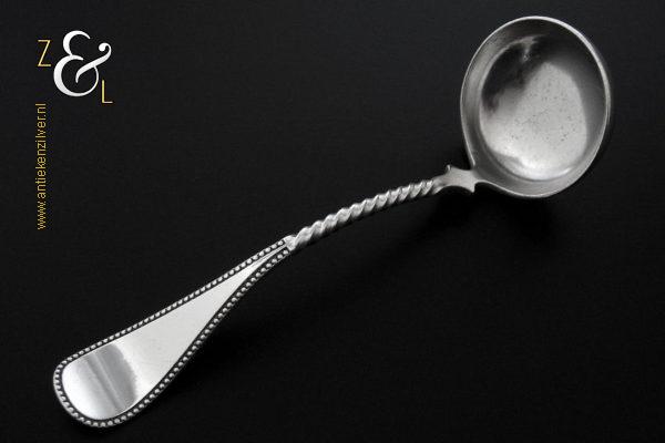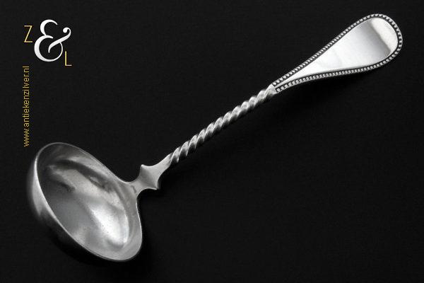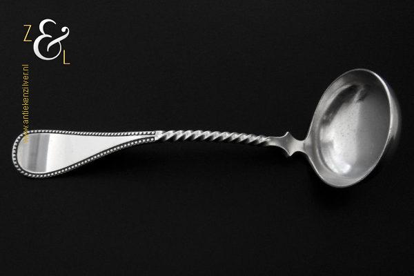 Sauslepel gemaakt in Voorschoten door de Firma J.M. van Kempen & Zonen (meesterteken liggend maantje tussen punten boven VK in vierkant) in het jaar 1902 (jaarletter S). De zilveren Neostijl sauslepel die een getordeerde steel heeft is uitgevoerd met een handvat in model parelrand. De sauslepel weegt 71 gram en is 17 cm lang. De lepelbak heeft een diameter van 5.2 cm. De sauslepel heeft gebruikssporen.