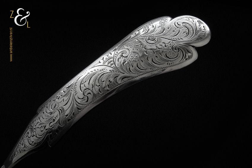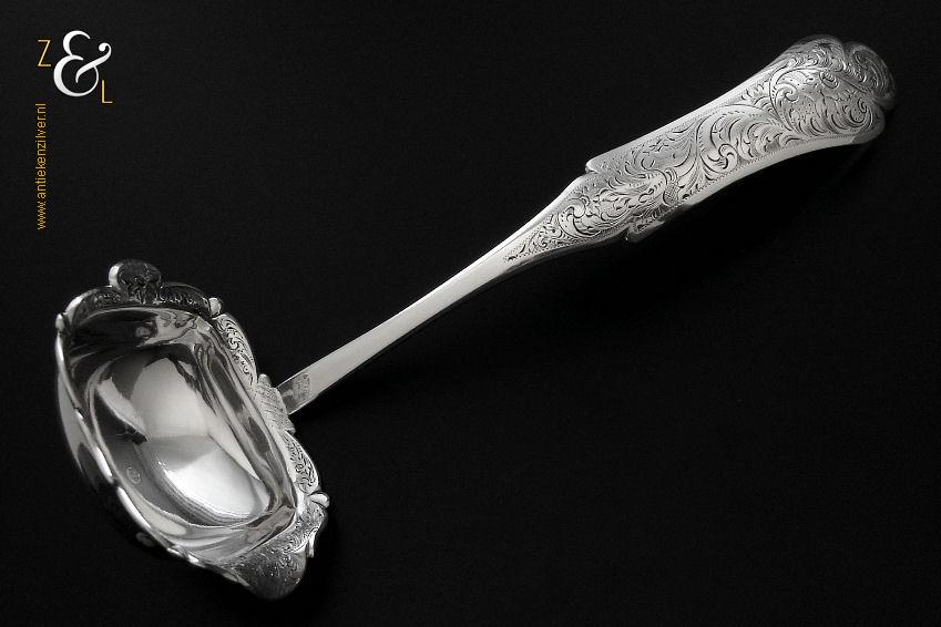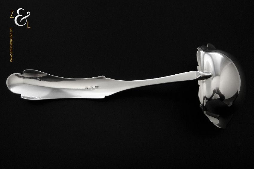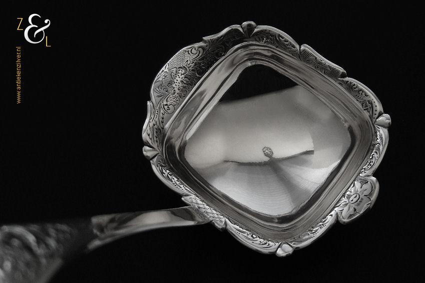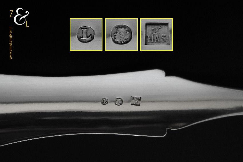 Deze soepdienlepel / sauslepel / ragoutlepel is gemaakt in Amsterdam door H.A. Schuss (meesterteken HAS onder anker in vierkant) in het jaar 1845 (jaarletter L). De zilveren Biedermeier soepdienlepel / sauslepel / ragoutlepel heeft een gecontourneerde lepelbak die gegraveerd is met bloem- en bladmotieven. Leuk detail is dat op de schenklip van de lepelbak een gestileerde haan is gegraveerd (zie laatste afbeelding). Het handvat is uitgevoerd met een diepe gravering van c-vormige voluten. De soepdienlepel / sauslepel / ragoutlepel weegt 111 gram en is 23.3 cm lang. De rechthoekige lepelbak is 8.5 cm lang bij 6.5 cm breed.