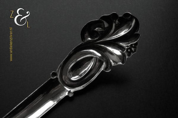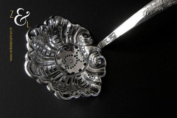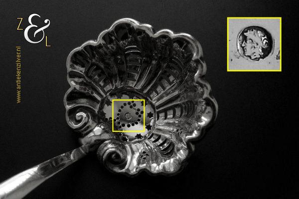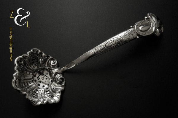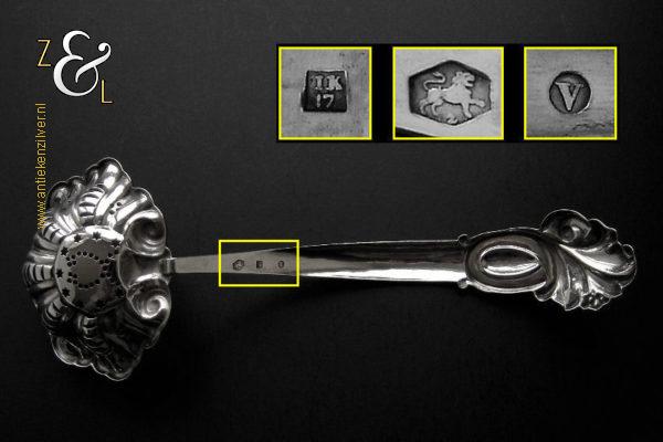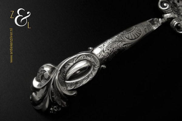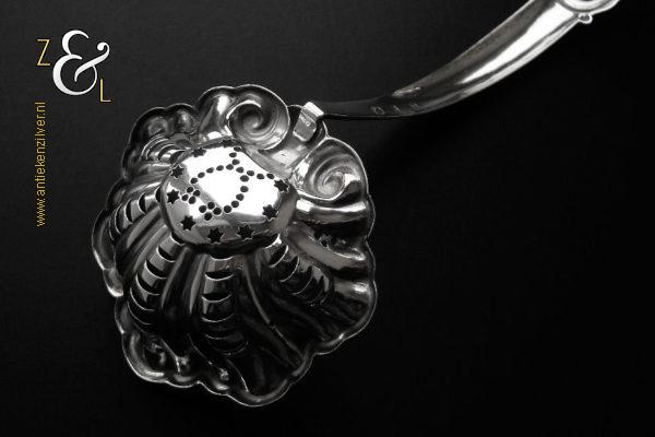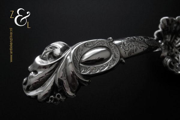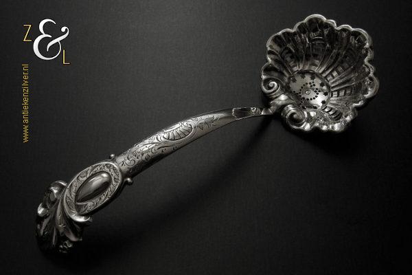 Deze suikerstrooilepel is gemaakt in Oss / Schijndel door Johannes Lambertus Kroijmans (meesterteken IK boven 17 in vierkant) in het jaar 1855 (jaarletter V). De in Neostijl uitgevoerde zilveren suikerstrooilepel weegt 25 gram en is 17.6 cm lang. De gegraveerde, gecontourneerde, gerepousseerde en geciseleerde suikerstrooilepel heeft een in Lodewijk de veertiende stijl schelpvormige strooibak van 6.3 cm lang bij 6 cm breed.