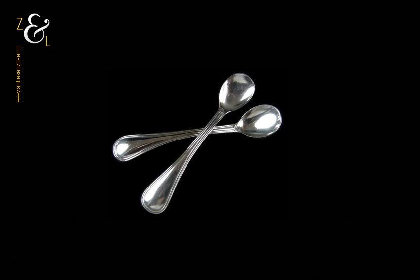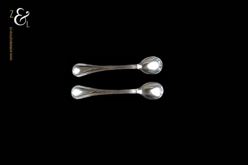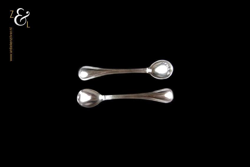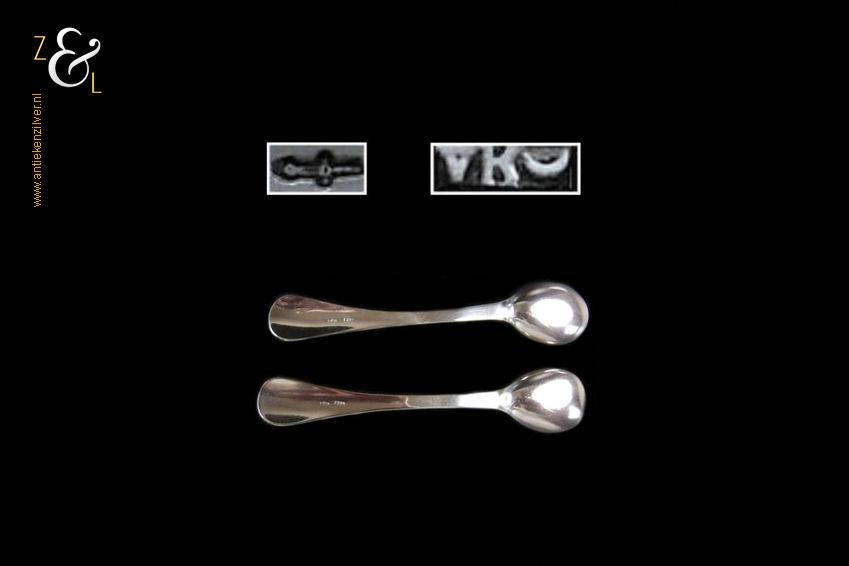 Dit stel zoutlepels / mosterdlepels is gemaakt in Voorschoten door de Firma J.M. van Kempen & Zonen (meesterteken VK liggend maantje in rechthoek) tussen 1906 en 1924 gekeurd met het zilverkeur zwaardje (dit is het gehaltemerk voor kleine zilveren werken) dat tussen 1906 en 1953 in gebruik was. De in dubbel rondfilet uitgevoerde zilveren zoutlepels / mosterdlepels wegen samen 14 gram en zijn 8.8 cm lang.