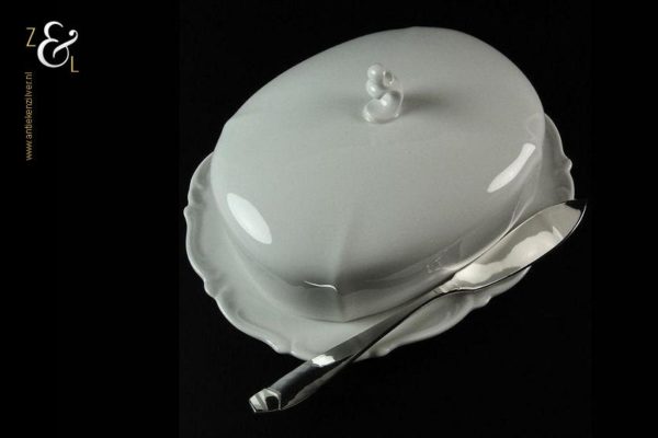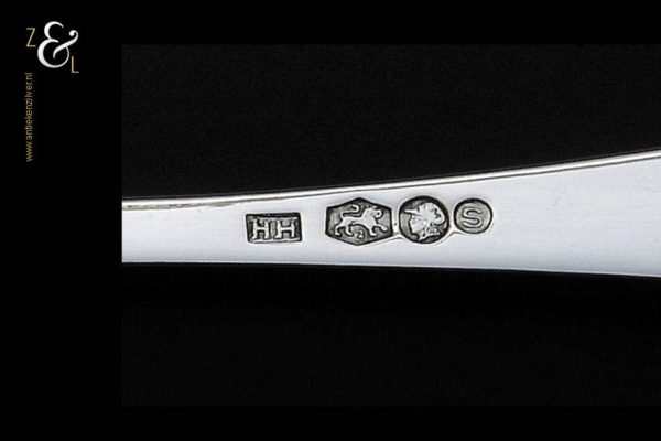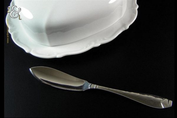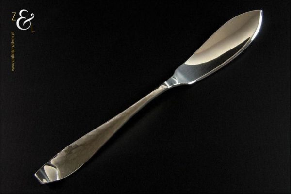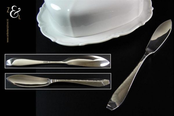 Botermes gemaakt in Schoonhoven door de Firma H. Hooijkaas (meesterteken HH in rechthoek) in het jaar 1928 (jaarletter S). Dit in Art Deco uitgevoerde zilveren botermes waarvan de steel gehamerd is, weegt 33 gram en is 16.1 cm lang. De botervloot dient ter decoratie.