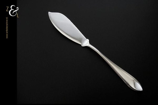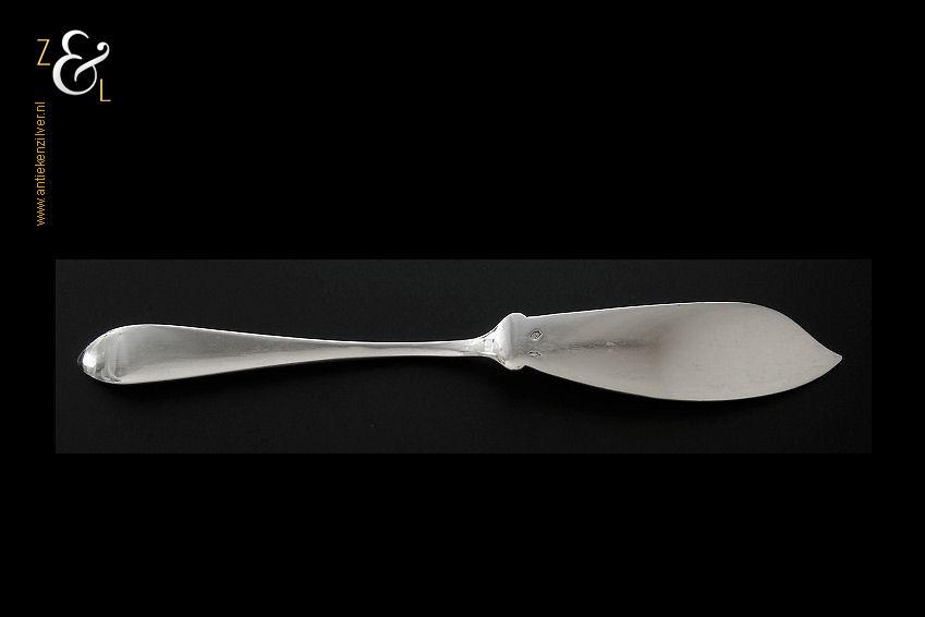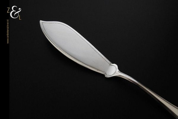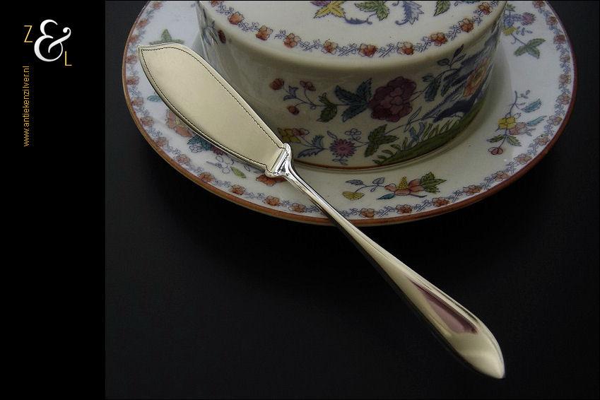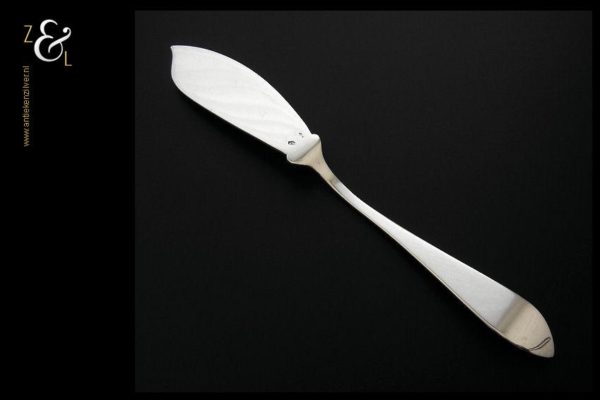 Botermes gemaakt in Zeist door Gerritsen & van Kempen N.V. (meesterteken V.K. in G) tussen 1926 en 1953. Dit in model puntfilet uitgevoerde zilveren botermes weegt 28 gram en is 16.2 cm lang. De botervloot dient ter decoratie.
