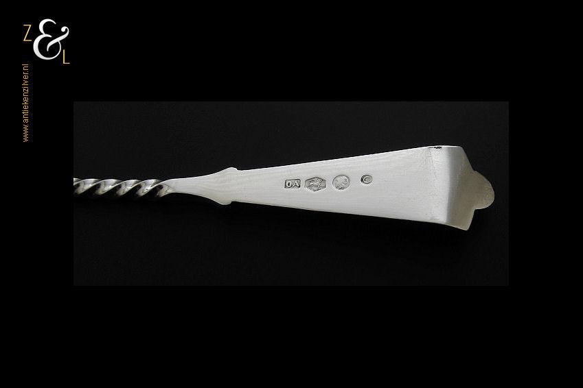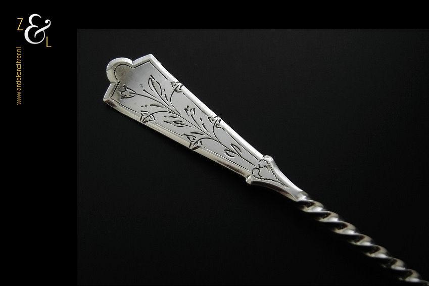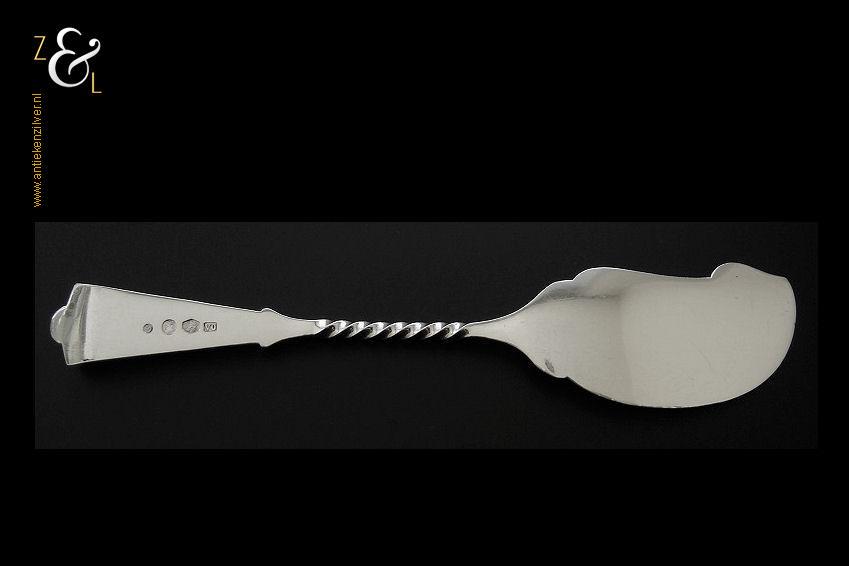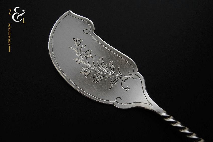 Boterspatel gemaakt in Schoonhoven door J. van Os van den Abeelen (meesterteken OA in vierkant) in het jaar 1912 (jaarletter C). Deze in Art Nouveau uitgevoerde en met bloemmotieven gegraveerde zilveren boterspatel weegt 25 gram en is 16.2 cm lang.