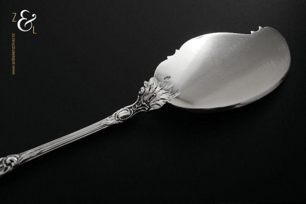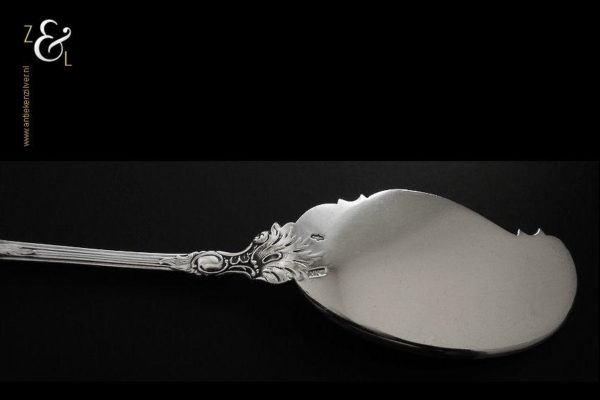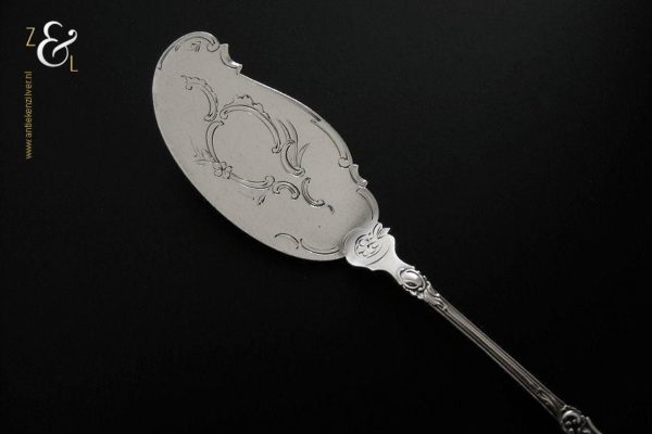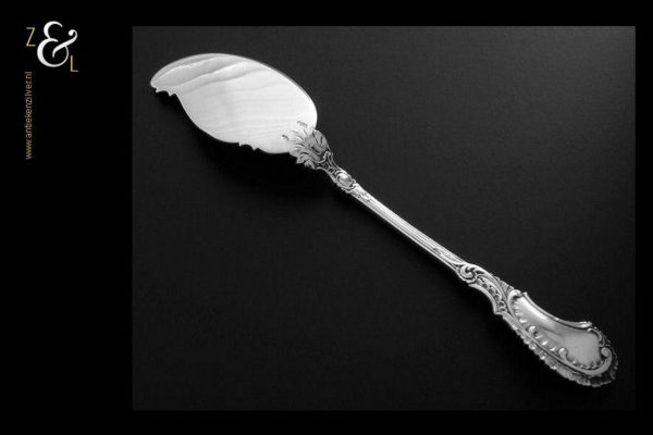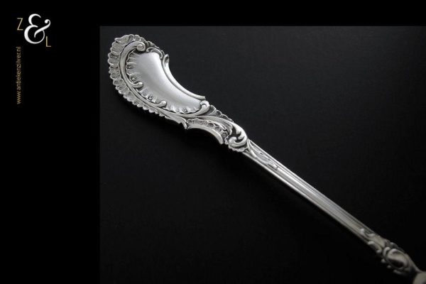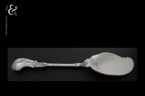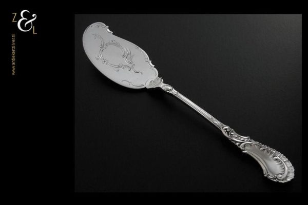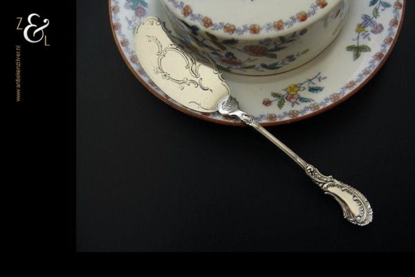 Boterspatel gemaakt in Voorschoten door de Firma J.M. van Kempen & Zonen (meesterteken VK liggend maantje in rechthoek) tussen 1906 en 1924. Deze in Neostijl uitgevoerde zilveren boterspatel weegt 35 gram en is 15.5 cm lang. De botervloot dient ter decoratie.