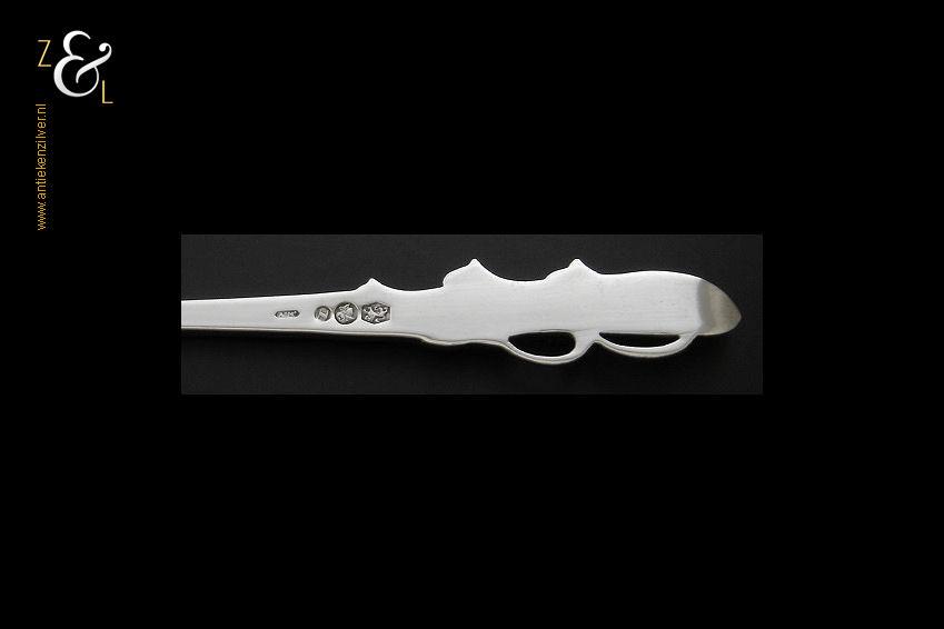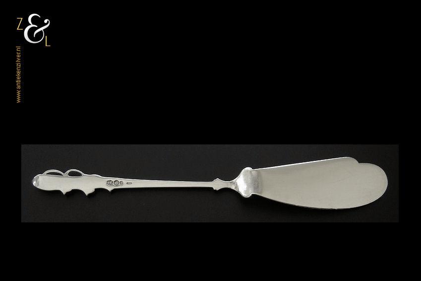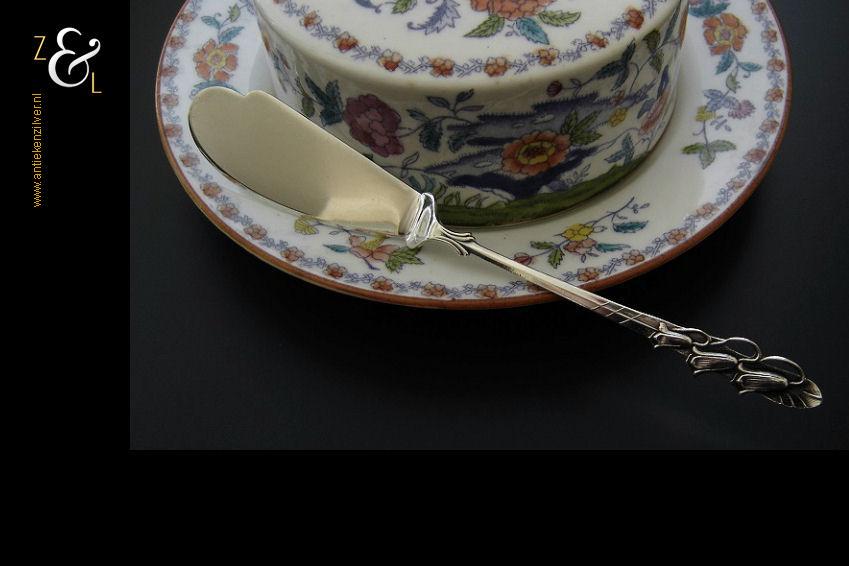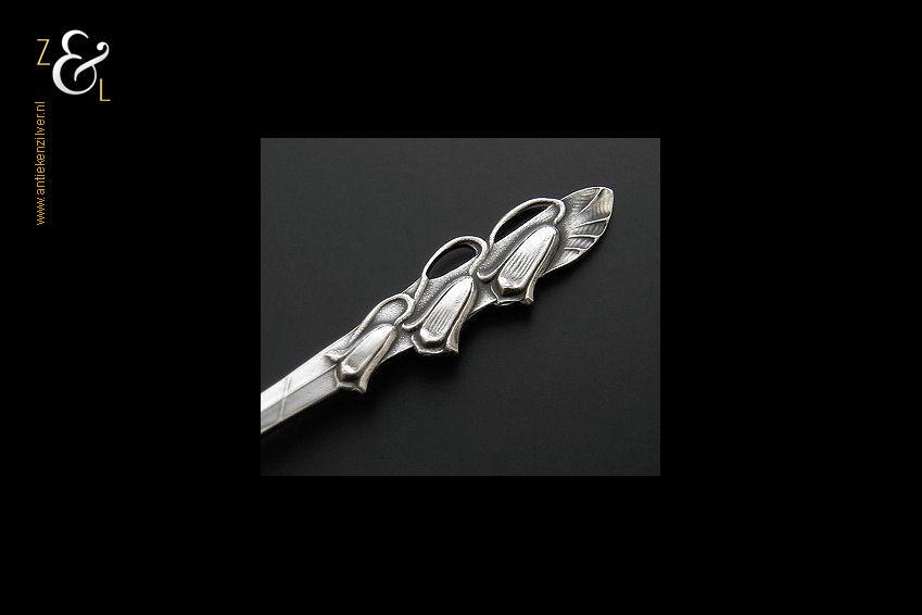 Boterspatel gemaakt in Schoonhoven door de Firma Arie Mesker & Zoon (meesterteken A2M2 in zeshoek) in het jaar 1948 (jaarletter N). Deze met lelietjes van dalen uitgevoerde zilveren boterspatel weegt 21 gram en is 16 cm lang. De botervloot dient ter decoratie.