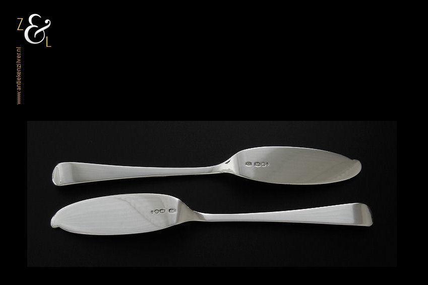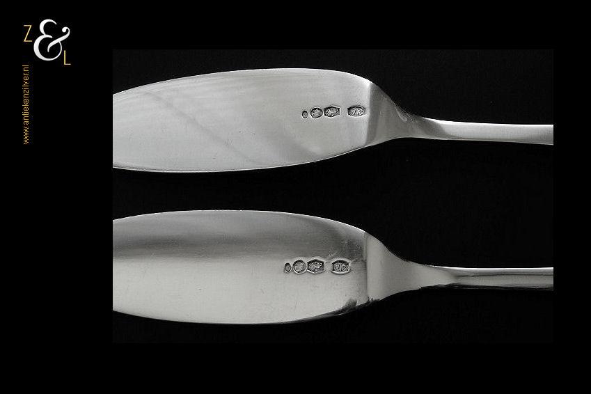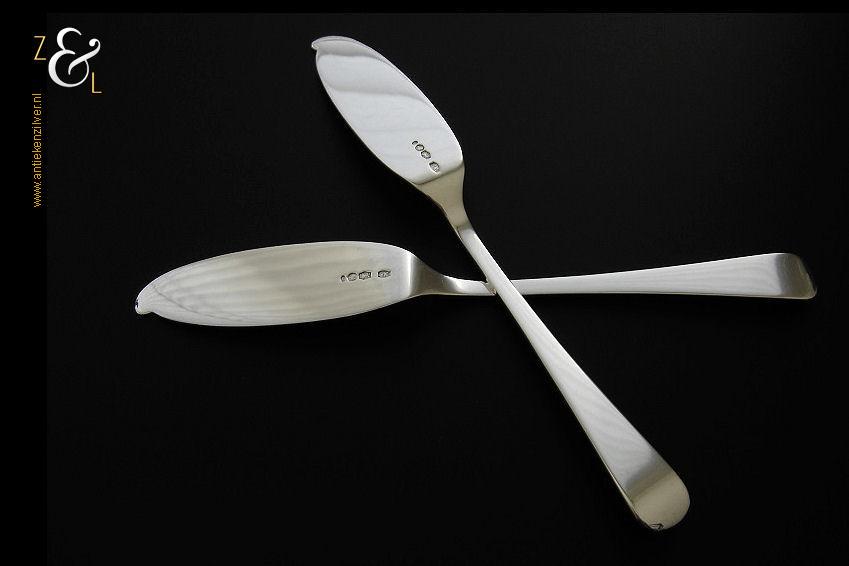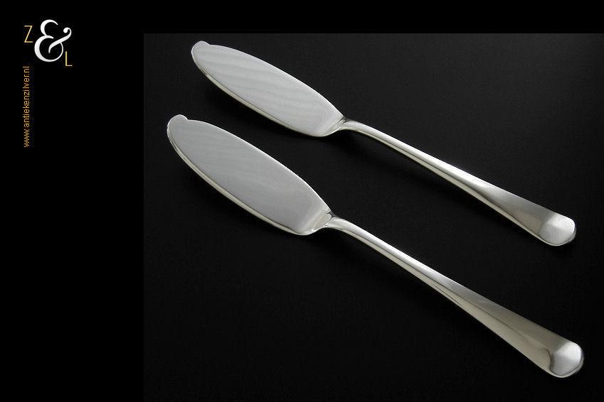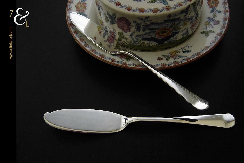 Stel botermessen gemaakt in Zeist door Gerritsen & van Kempen N.V. (meesterteken V.K. in G) in het jaar 1946 (jaarletter K). Dit in model Hollands glad uitgevoerde zilveren botermessen wegen samen 62 gram en zijn 16.2 cm lang. De botervloot dient ter decoratie.