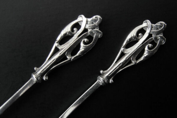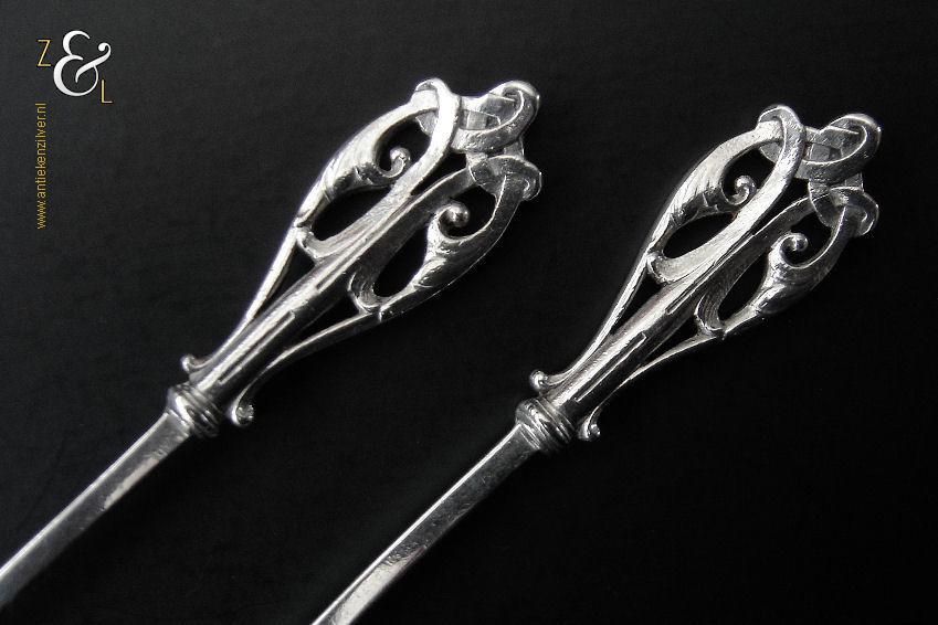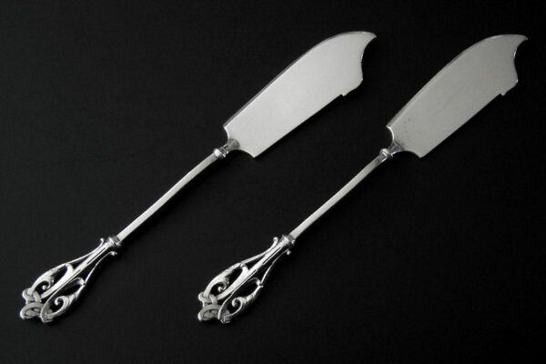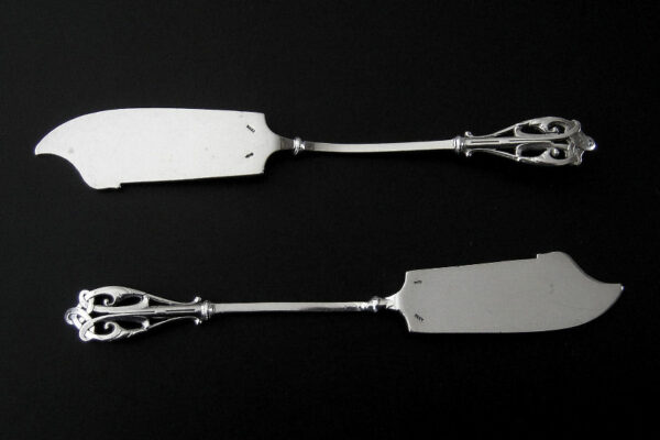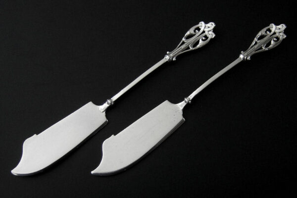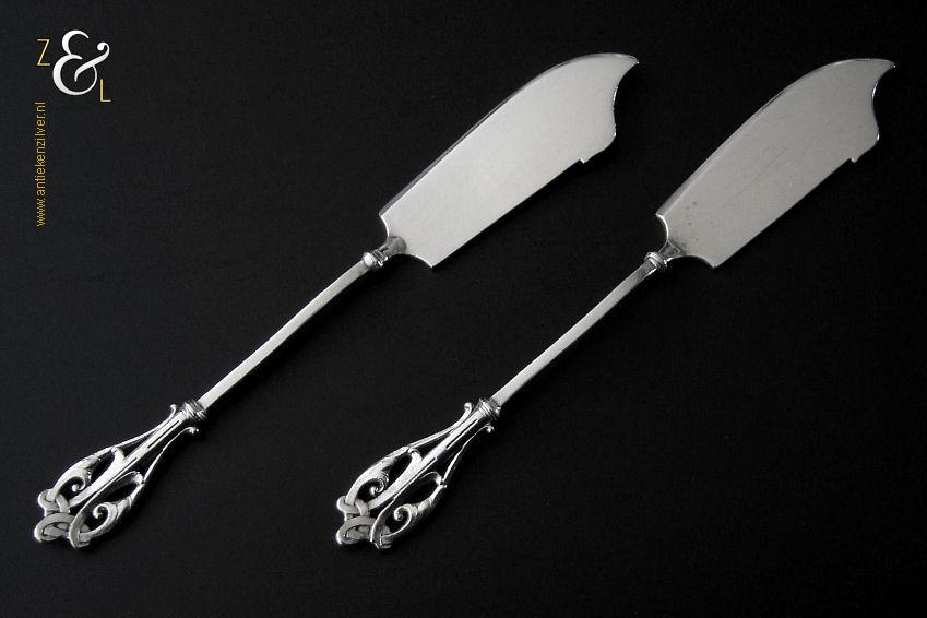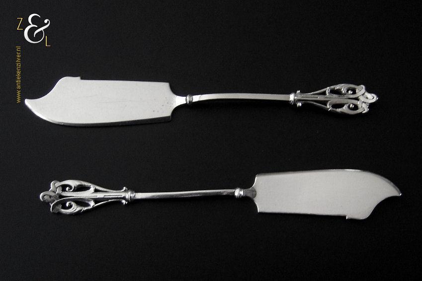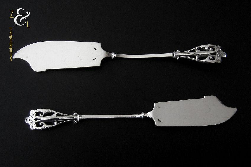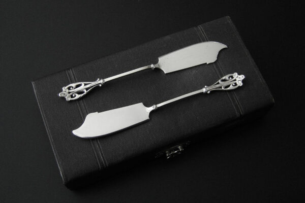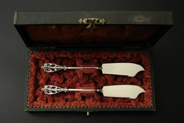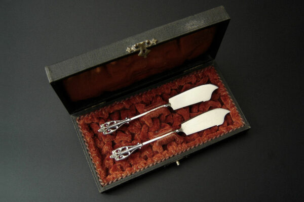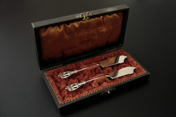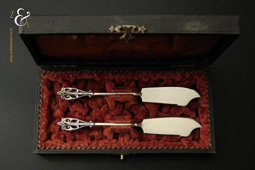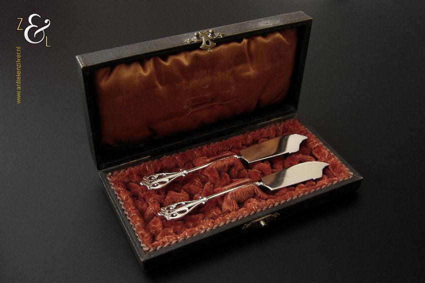 Dit stel botermessen is gemaakt in Voorschoten bij de Firma J.M. van Kempen & Zonen (meesterteken VK liggend maantje in rechthoek) tussen 1858 en 1905. Het stel botermessen is gekeurd met het zilverkeur zwaardje dit is een gehaltemerk voor zilveren voorwerpen dat in de periode tussen 1814 en 1905 in gebruik was. Het in model Art Nouveau DM uitgevoerde stel botermessen heeft gegoten stelen en handvatten. Tevens heeft het stel botermessen het originele zwarte foedraal (heeft lichte gebruikssporen) dat aan de binnenzijde van het deksel gestoffeerd is met oranjekleurige zijde waarop in glanzend goud gedrukt: J.M. van Kempen & Zonen Hofjuweliers met daarboven een kroon (heeft slijtage en is niet helemaal leesbaar). Verder heeft het foedraal aan de onderzijde waarin het stel botermessen geklemd zit een rood geplooid velours interieur. Het stel botermessen weegt 53 gram en is 15.3 cm lang. Het foedraal is 19 cm lang bij 9.5 cm breed bij 3.5 cm hoog. Het stel botermessen heeft gebruikssporen (krasjes op het lemmet).