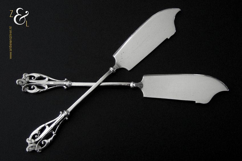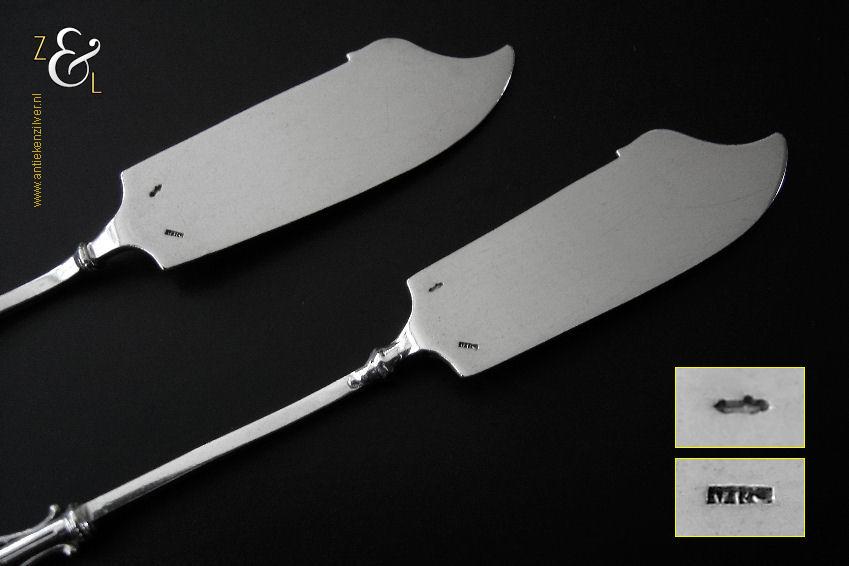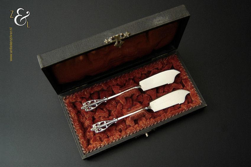 Dit stel botermessen is gemaakt in Voorschoten bij de Firma J.M. van Kempen & Zonen (meesterteken VK liggend maantje in rechthoek) tussen 1858 en 1905. Het stel botermessen is gekeurd met het zilverkeur zwaardje dit is een gehaltemerk voor zilveren voorwerpen dat in de periode tussen 1814 en 1905 in gebruik was. Het in model Art Nouveau DM uitgevoerde stel botermessen heeft gegoten stelen en handvatten. Tevens heeft het stel botermessen het originele zwarte foedraal (heeft lichte gebruikssporen) dat aan de binnenzijde van het deksel gestoffeerd is met oranjekleurige zijde waarop in glanzend goud gedrukt: J.M. van Kempen & Zonen Hofjuweliers met daarboven een kroon (heeft slijtage en is niet helemaal leesbaar). Verder heeft het foedraal aan de onderzijde waarin het stel botermessen geklemd zit een rood geplooid velours interieur. Het stel botermessen weegt 53 gram en is 15.3 cm lang. Het foedraal is 19 cm lang bij 9.5 cm breed bij 3.5 cm hoog. Het stel botermessen heeft gebruikssporen (krasjes op het lemmet).