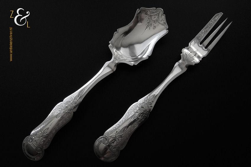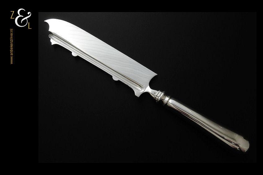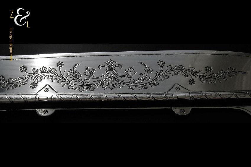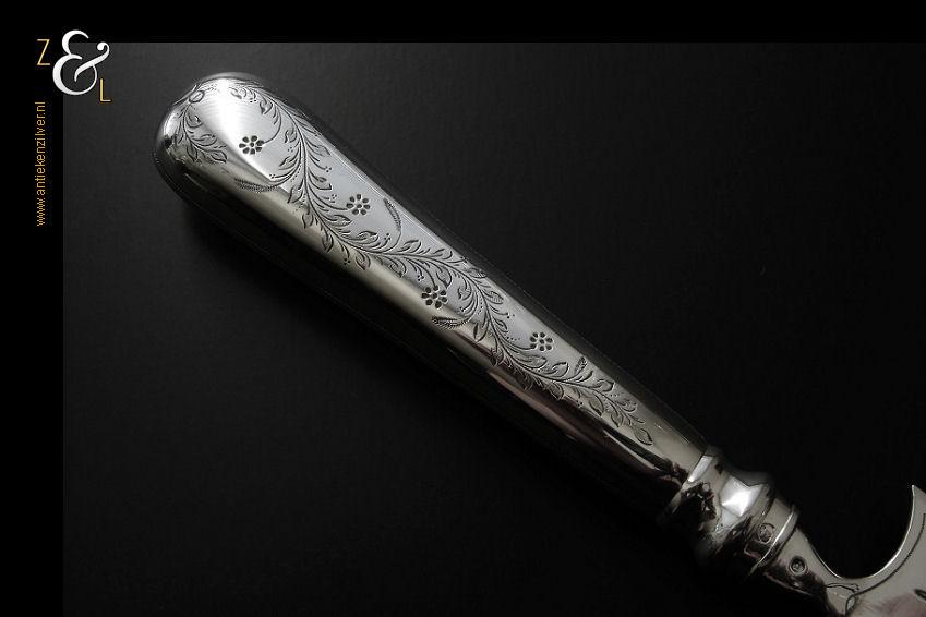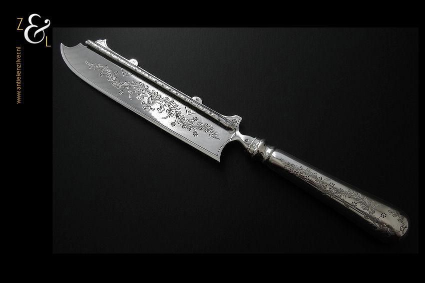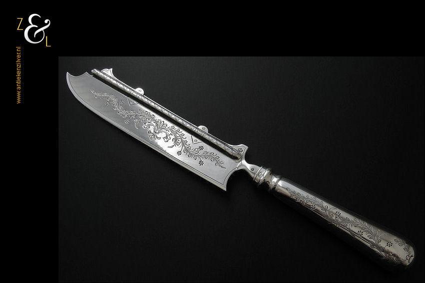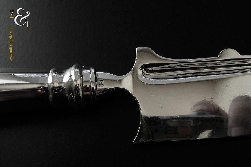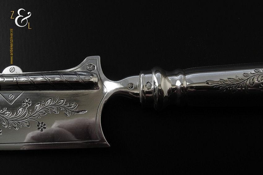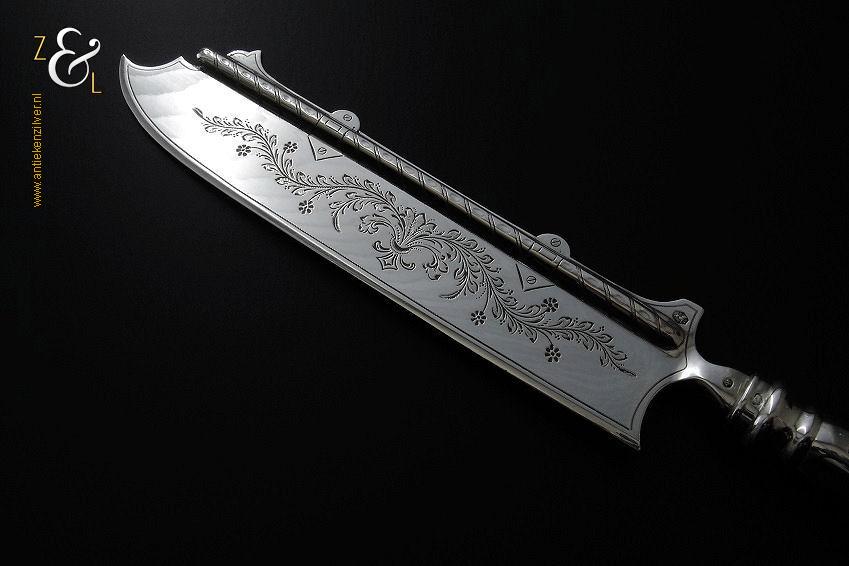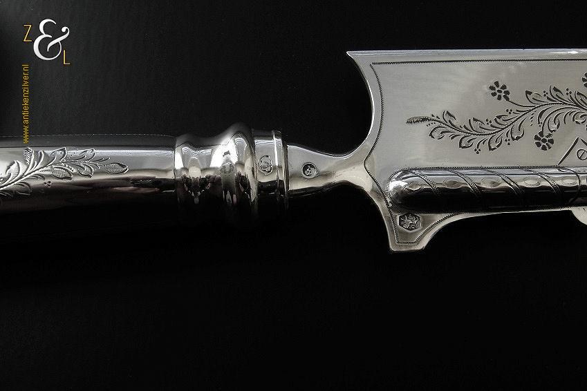 Dit prachtige gegraveerde huwelijkstaart- bruidstaartmes is gemaakt in Schoonhoven door Adrianus Kuijlenburg (meesterteken AK boven * 47 in vierkant) in het jaar 1884 (jaarletter Z). Het geheel zilveren (ook het lemmet is van zilver) mes weegt 109 gram is 32 cm lang en 4 cm breed.