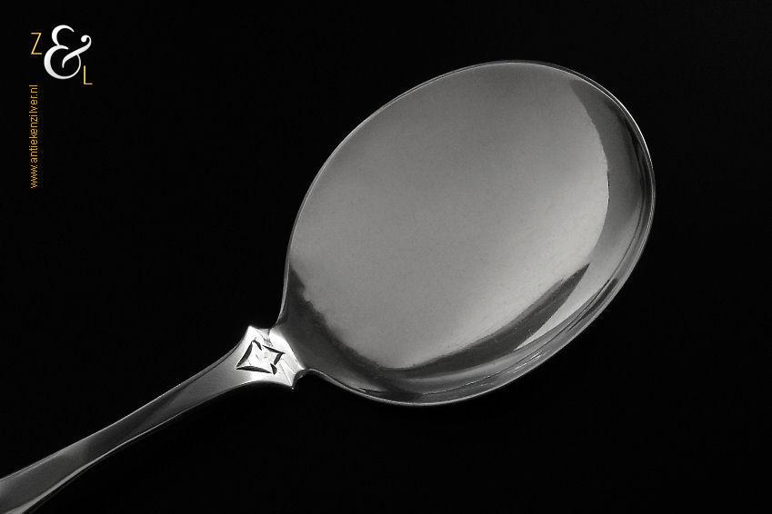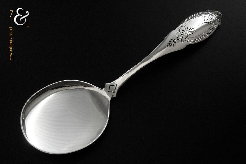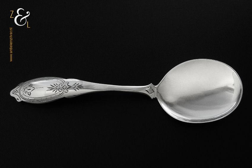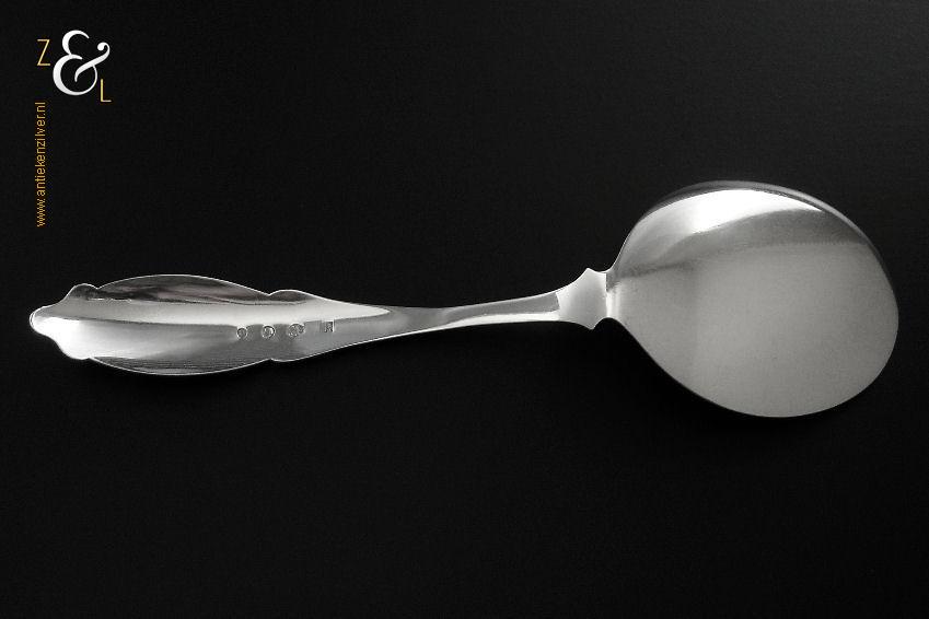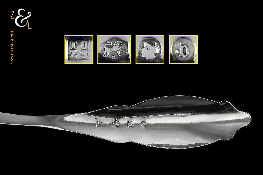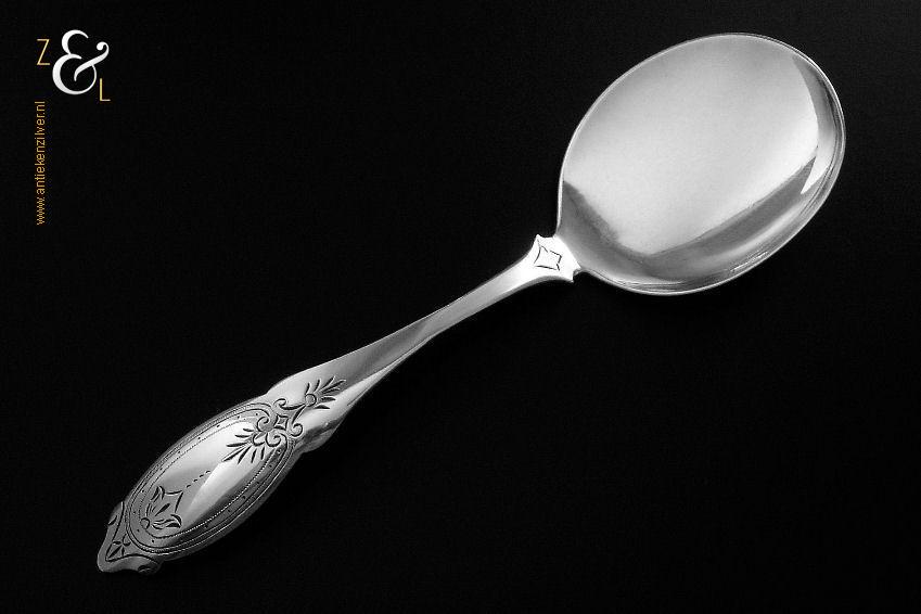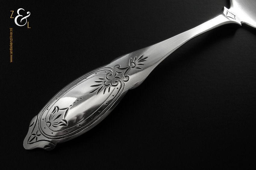 Deze ijsdienschep / ijsschep is gemaakt in Amsterdam door Theodorus Lambertus & Pierre Louis Uriot (Firma T.L. Uriot & Zoon) (meesterteken TU boven Z3 in vierkant) in het jaar 1880 (jaarletter V). De zilveren ijsdienschep / ijsschep met elegant gegraveerde steel weegt 40 gram en is 19 cm lang. Het schepgedeelte is 7 cm lang bij 5.5 cm breed.