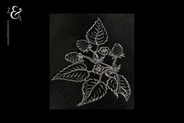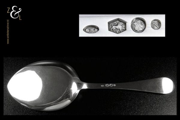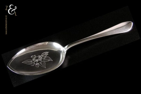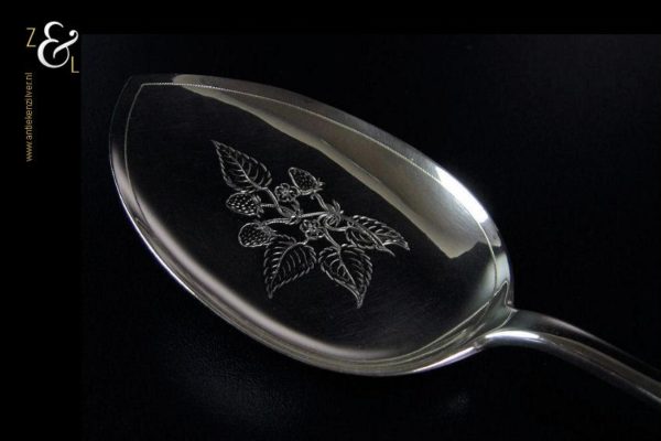 Deze natfruitschep / aardbeienschep is gemaakt in Schoonhoven / Rijswijk door G. Reijnen (meesterteken GR* in puntovaal) in het jaar 1923 (jaarletter N). De zilveren in model puntfilet uitgevoerde natfruitschep / aardbeienschep waarvan de bak is gegraveerd met een aardbeienplant weegt 70 gram en is 20.7 cm lang. Het schepgedeelte is 9.2 cm lang bij 6 cm breed.