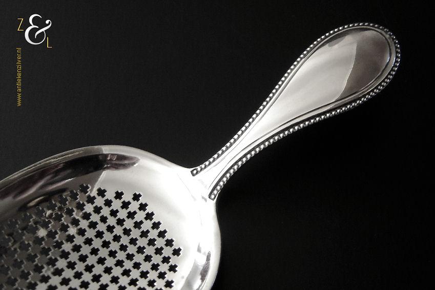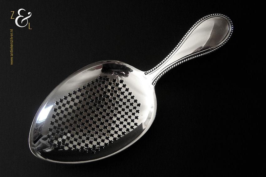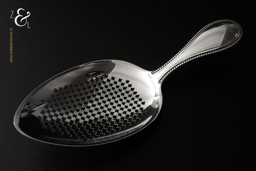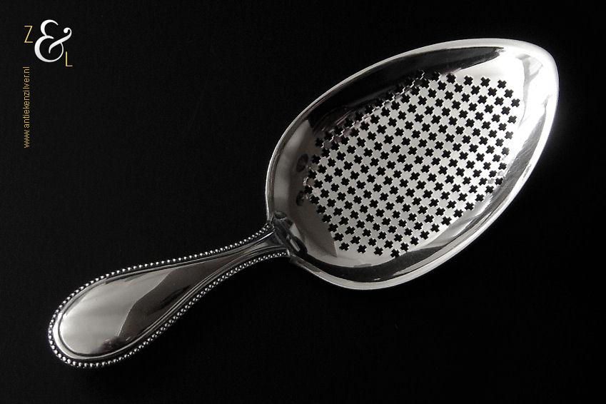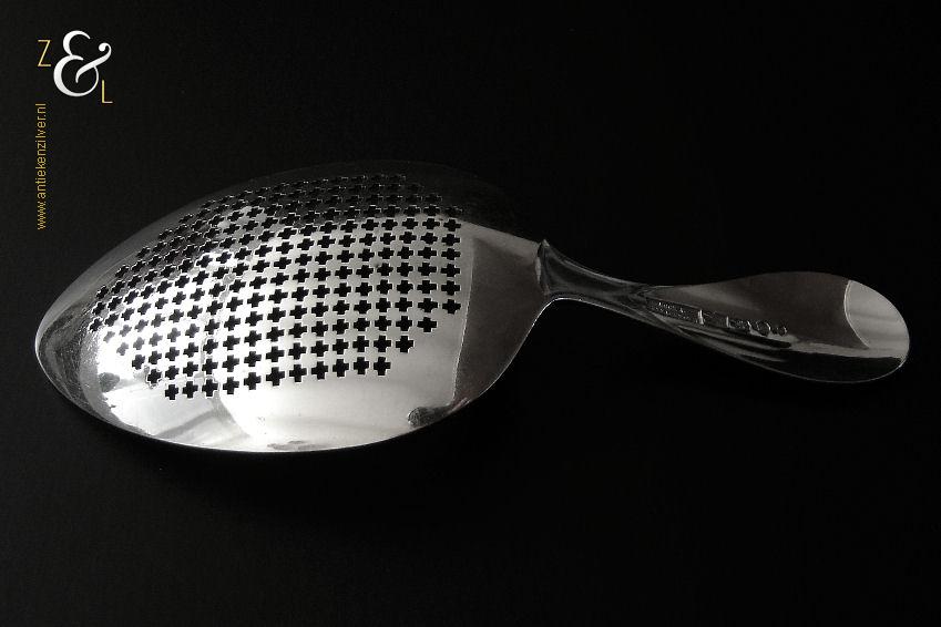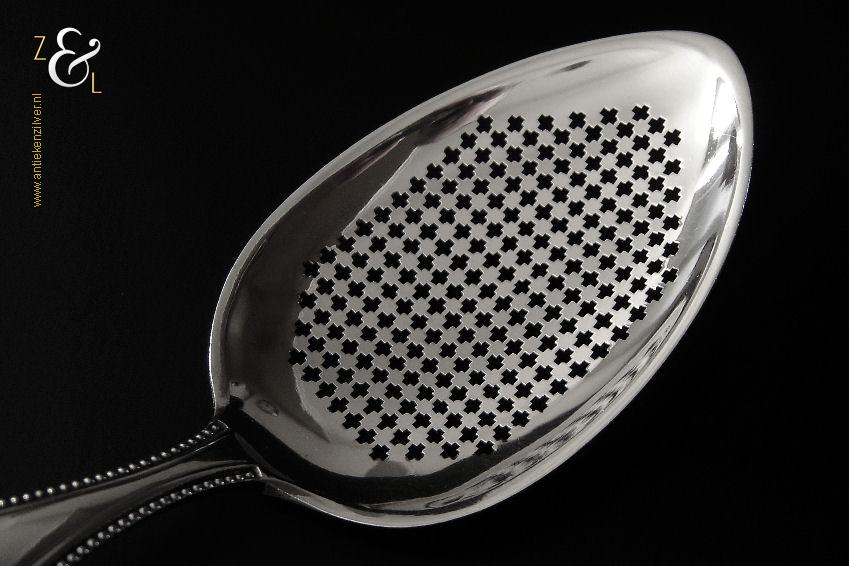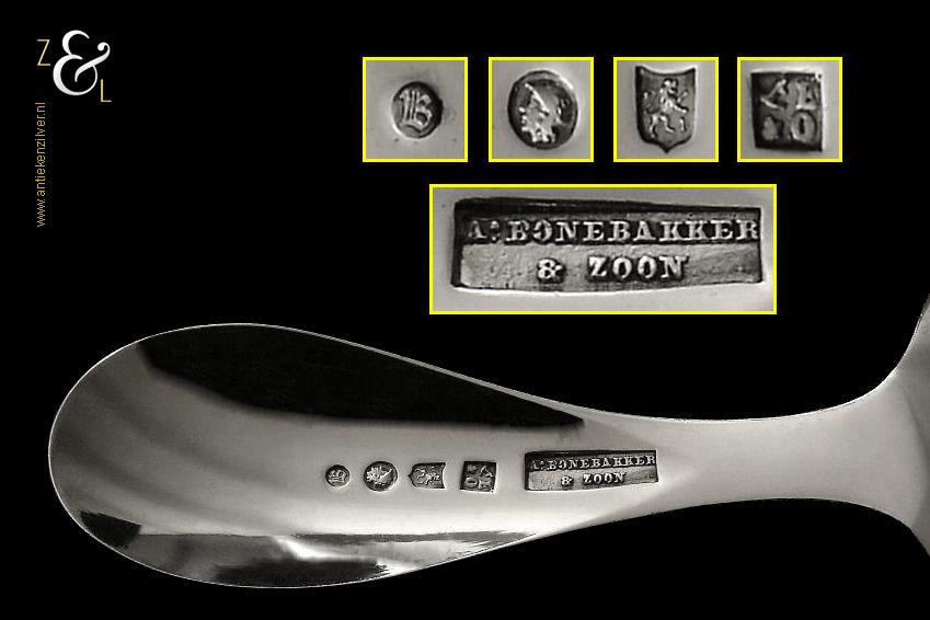 Deze natfruitschep is gemaakt in Amsterdam door Jan Hendrik Eversbag & Daniël van Outvorst (meesterteken anker E boven & O in vierkant) in het jaar 1886 (jaarletter B). Tevens heeft de natfruitschep het winkeliersmerk van A. Bonebakker & Zoon deze firma is sinds 1792 bekend vanwege de verkoop van zilveren voorwerpen van zéér hoge kwaliteit. De eerste gehalte zilveren in Jugendstil uitgevoerde natfruitschep heeft een steel met parelrand en een met plusjes uitgezaagd schepgedeelte. De natfruitschep weegt 60 gram en is 17.1 cm lang. De in ovaalpunt gevormde schep is 10 cm lang bij 6.5 cm breed.