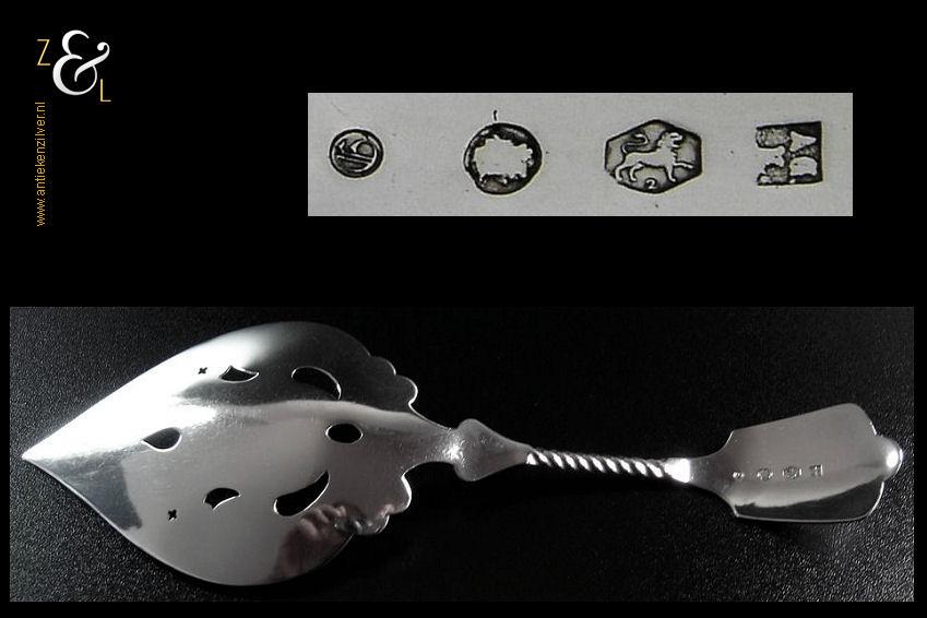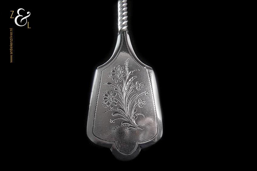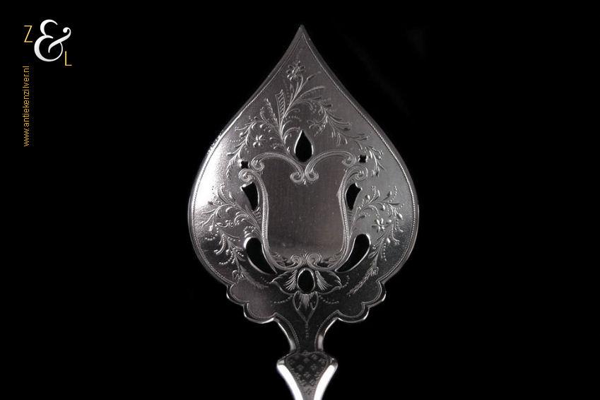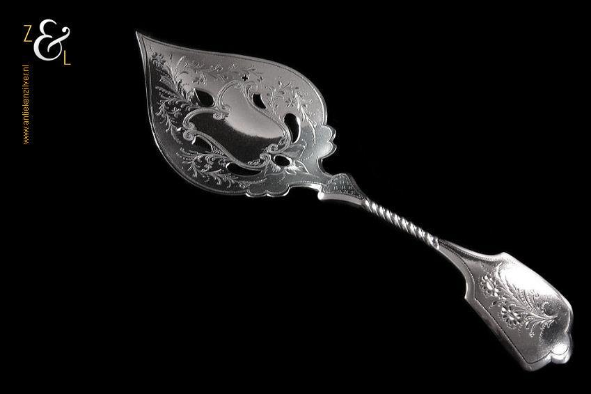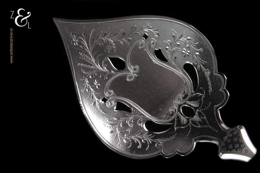 Natfruitschep gemaakt in Schoonhoven door Adrianus Andries Graves Kooiman (meesterteken A.G. boven K. in vierkant) in het jaar 1891 (jaarletter G). Deze met bloemen gegraveerde en deels gematteerde (matteren is een bewerking waarbij de zilversmid het oppervlak van een zilveren voorwerp een matte structuur geeft) zilveren natfruitschep weegt 47 gram en is 20.3 cm lang.