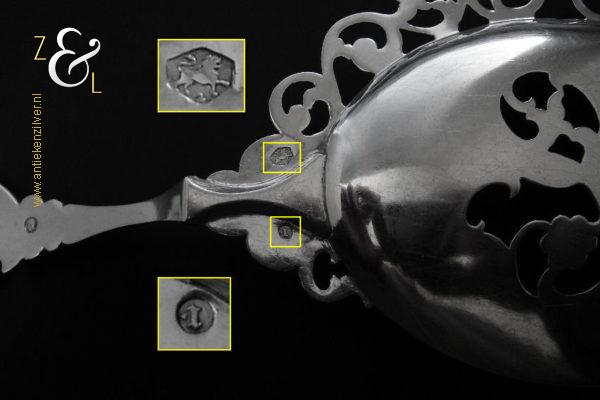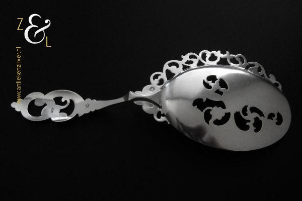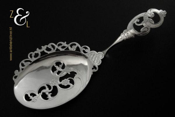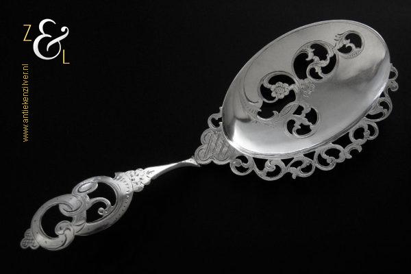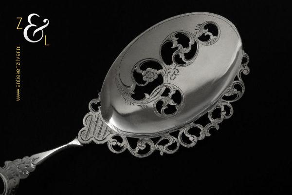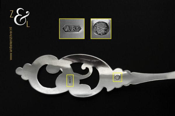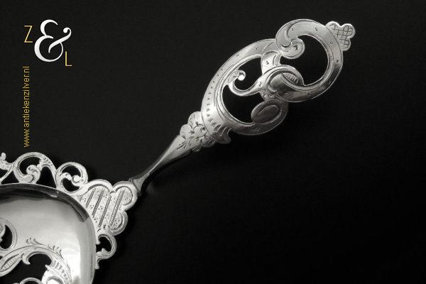 Deze natfruitschep / pasteischep is gemaakt in Den Bosch / ‘s-Hertogenbosch door Augustinus de Rooij (meesterteken AR naast 5 in zeshoek) in het jaar 1868 (jaarletter I). Het jaarletter op deze natfruitlepel heeft een ster, dit geeft aan dat de keurmeester tijdens dit jaar werd opgevolgd of overleden was.* De zilveren Neostijl natfruitschep / pasteischep heeft een fijntjes uitgezaagd schepgedeelte en handvat die gegraveerd zijn met c-vormige voluten. De natfruitschep / pasteischep weegt 43 gram en is 20.1 cm lang. Het schepgedeelte is 11.3 cm lang bij 7.5 cm breed.