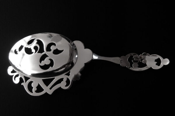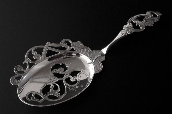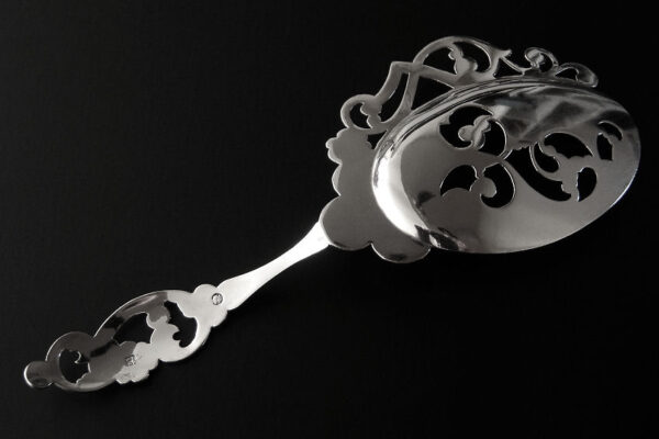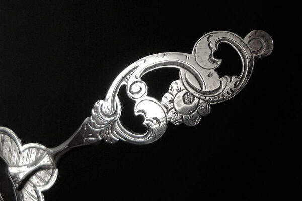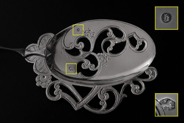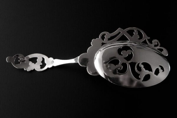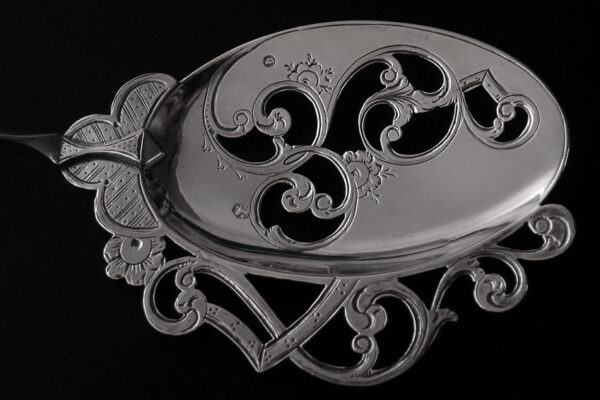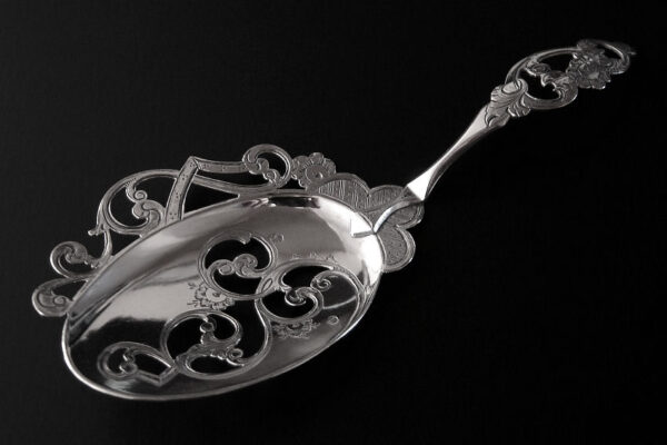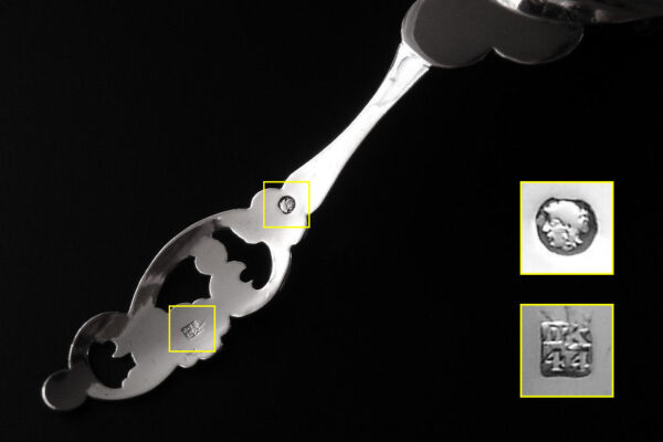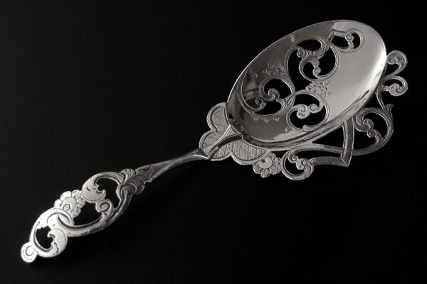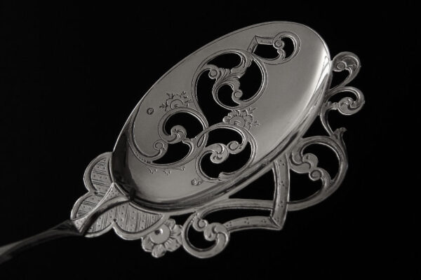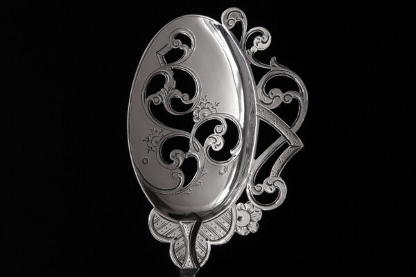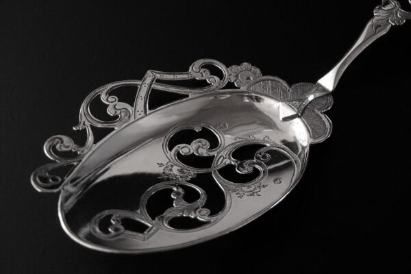 Deze natfruitschep / pasteischep is gemaakt in Den Bosch / ‘s-Hertogenbosch door Antonius Hendrikus der Kinderen (meesterteken DK boven 44 in vierkant) in het jaar 1867 (jaarletter H). De zilveren Neostijl natfruitschep / pasteischep heeft een sierlijk uitgezaagd schepgedeelte en handvat die gegraveerd zijn met c-vormige voluten en bloemmotieven. De natfruitschep / pasteischep weegt 29 gram en is 17.2 cm lang. Het schepgedeelte is 9.1 cm lang bij 6.7 cm breed.