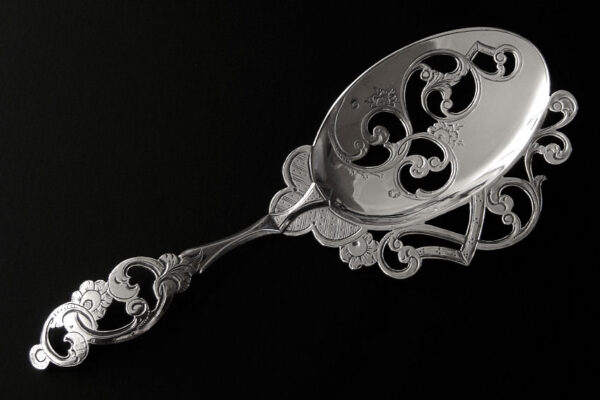 Deze natfruitschep / pasteischep is gemaakt in Den Bosch / ‘s-Hertogenbosch door Antonius Hendrikus der Kinderen (meesterteken DK boven 44 in vierkant) in het jaar 1867 (jaarletter H). De zilveren Neostijl natfruitschep / pasteischep heeft een sierlijk uitgezaagd schepgedeelte en handvat die gegraveerd zijn met c-vormige voluten en bloemmotieven. De natfruitschep / pasteischep weegt 29 gram en is 17.2 cm lang. Het schepgedeelte is 9.1 cm lang bij 6.7 cm breed.