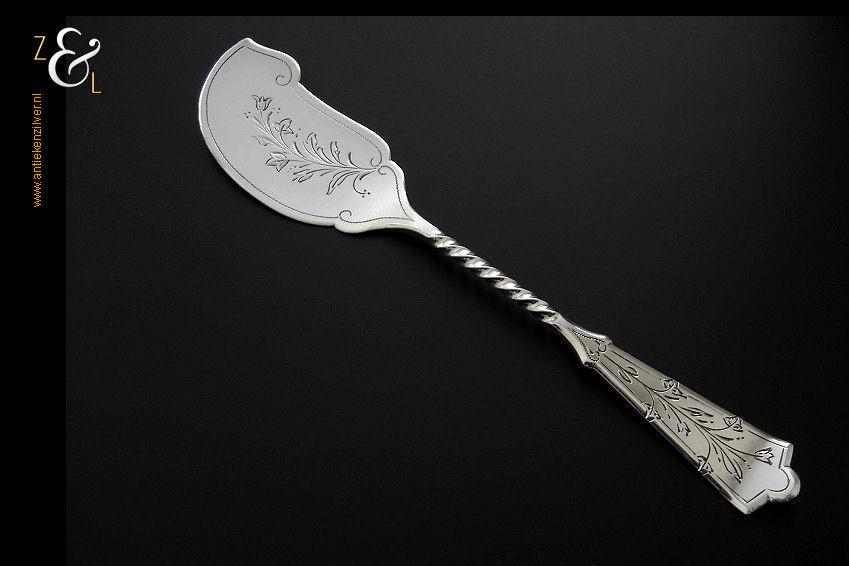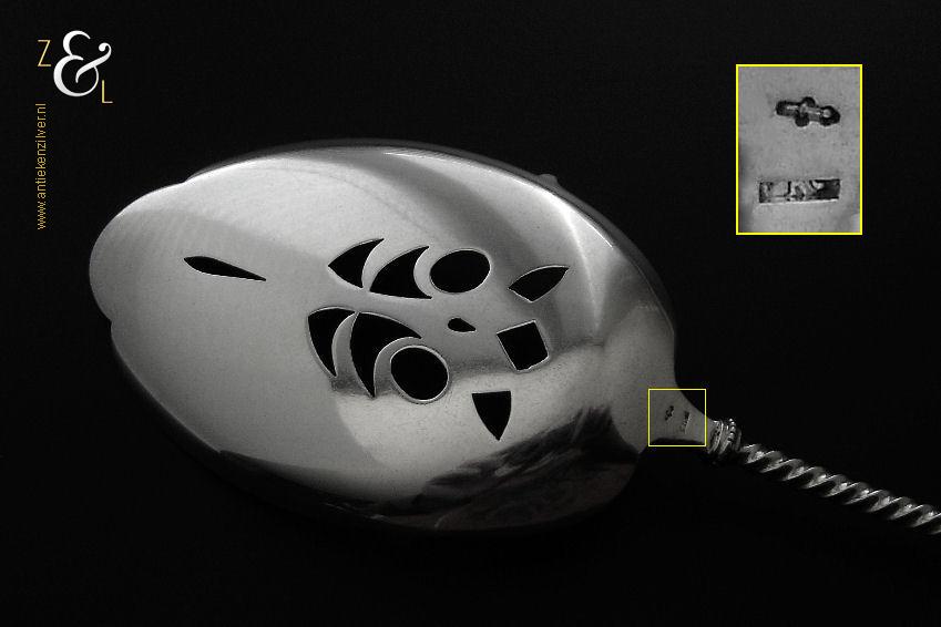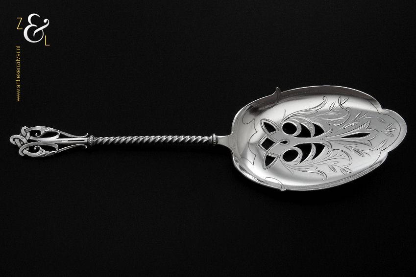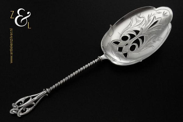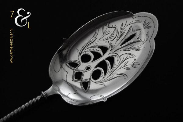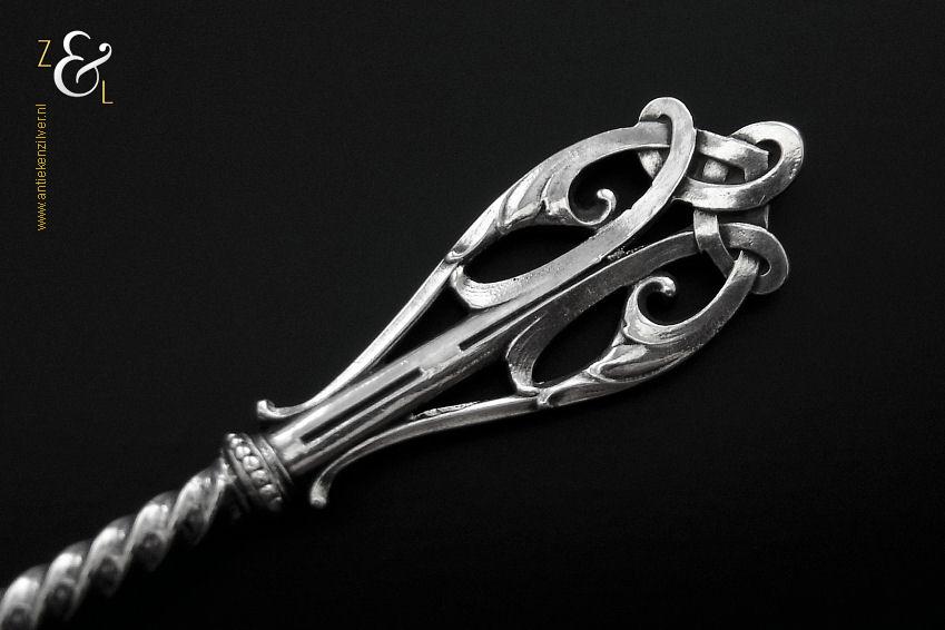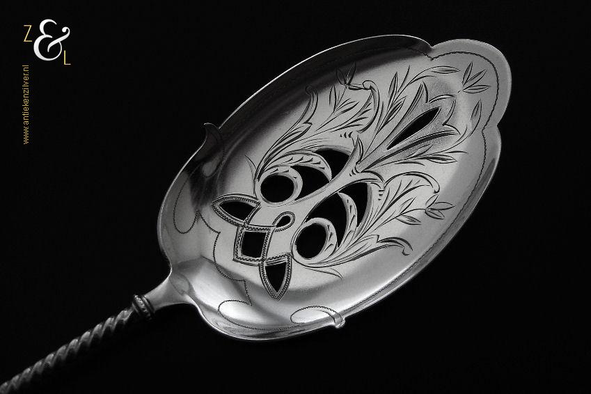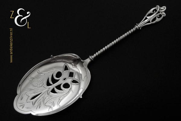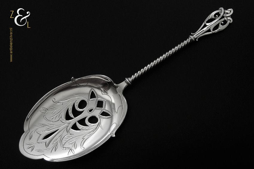 Deze natfruitschep / pasteischep / petitfourschep is gemaakt in Voorschoten bij de Firma J.M. van Kempen & Zonen ( meesterteken VK liggend maantje in rechthoek) tussen 1858 en 1905 (gekeurd met het zilverkeur zwaardje). De zilveren Art Nouveau natfruitschep / pasteischep / petitfourschep heeft een gegoten getordeerde steel en handvat. Tevens is het schepgedeelte gegraveerd, uitgezaagd en licht gematteerd (matteren is een bewerking waarbij de zilversmid het oppervlak van een zilveren voorwerp een matte structuur geeft). De natfruitschep / pasteischep / petitfourschep weegt 53 gram en is 20.5 cm lang. Het schepgedeelte is 9 cm lang bij 5.7 cm breed.