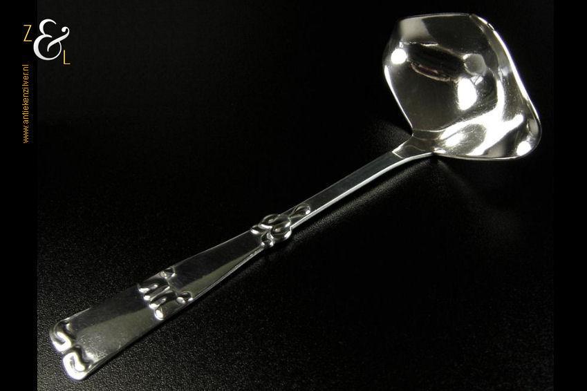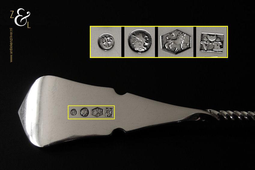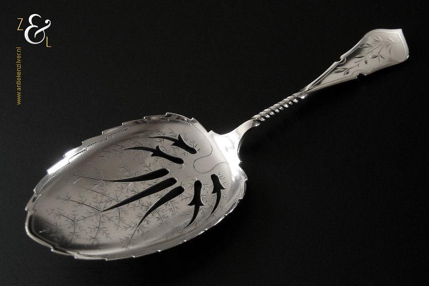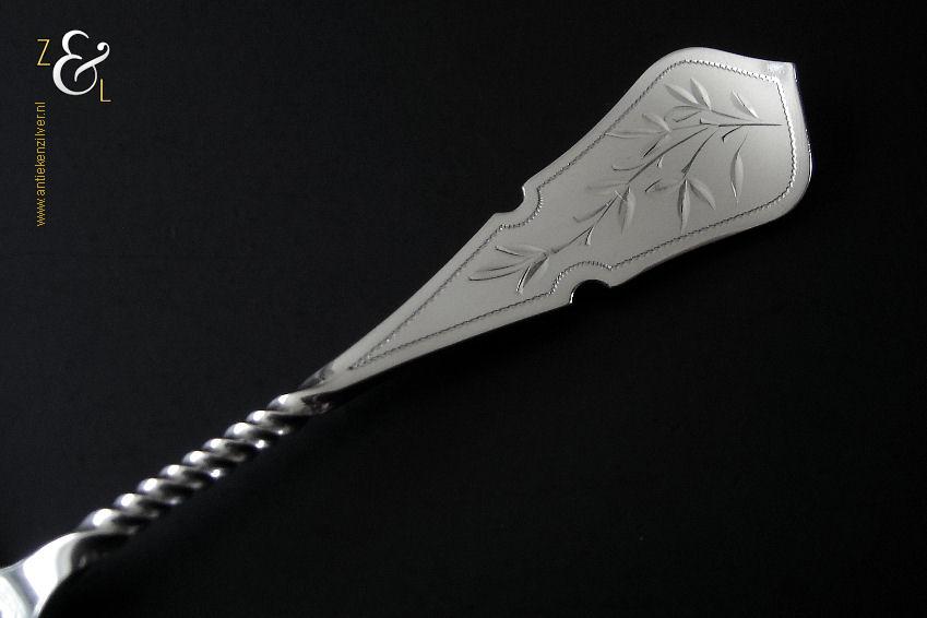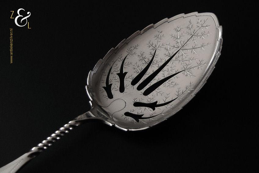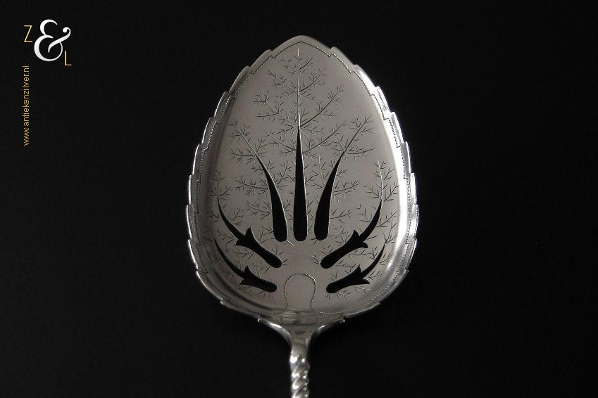 Deze natfruitschep / pasteischep / petitfourschep is gemaakt in Voorschoten bij de Firma J.M. van Kempen & Zonen ( meesterteken liggend maantje tussen punten boven VK in vierkant) in het jaar 1889 (jaarletter E). De zilveren Art Nouveau natfruitschep / pasteischep / petitfourschep heeft een getordeerde steel en een handvat dat gegraveerd is met een are (korenaar). Het schepgedeelte is uitgezaagd en gegraveerd met een tak motief. Tevens zijn het handvat en schepgedeelte licht gematteerd (matteren is een bewerking waarbij de zilversmid het oppervlak van een zilveren voorwerp een matte structuur geeft). De natfruitschep / pasteischep / petitfourschep weegt 47 gram en is 18.8 cm lang. Het schepgedeelte is 8.7 cm lang bij 5.7 cm breed.