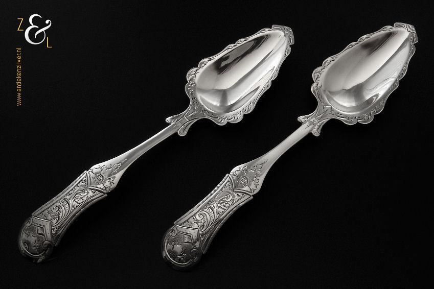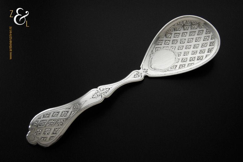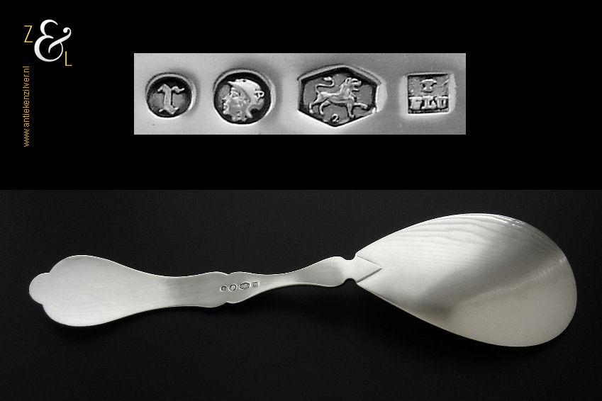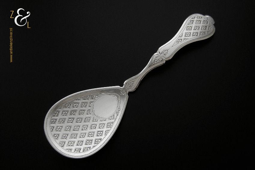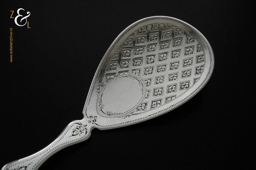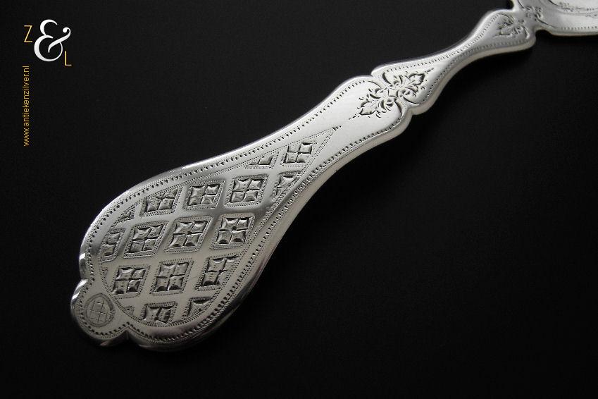 Deze pasteischep / petitfourschep / taartschep is gemaakt in Amsterdam door Theodorus Lambertus Uriot (meesterteken aambeeld boven FLU in vierkant) in het jaar 1876 (jaarletter R). De zilveren Neostijl pasteischep / petitfourschep / taartschep is gegraveerd en gestempeld met ruitmotieven en heeft op de schep een nog niet gebruikt cartouche die men kan gebruiken voor initialen of monogram. De pasteischep / petitfourschep / taartschep weegt 63 gram en is 22 cm lang. Het schepgedeelte is 9 cm lang bij 6.4 cm breed.