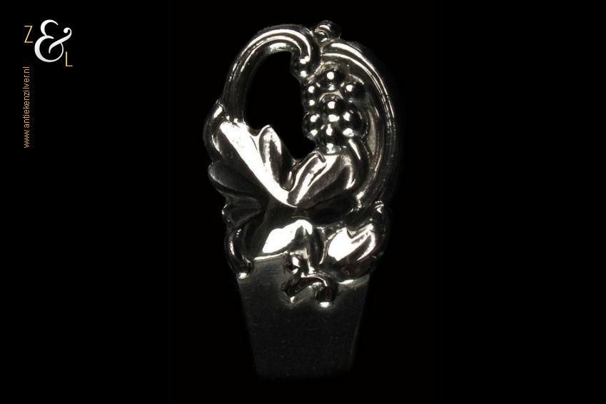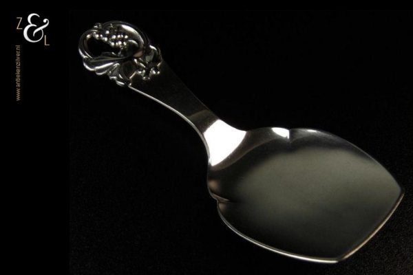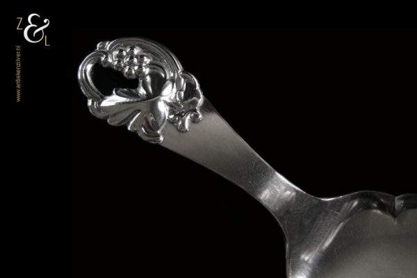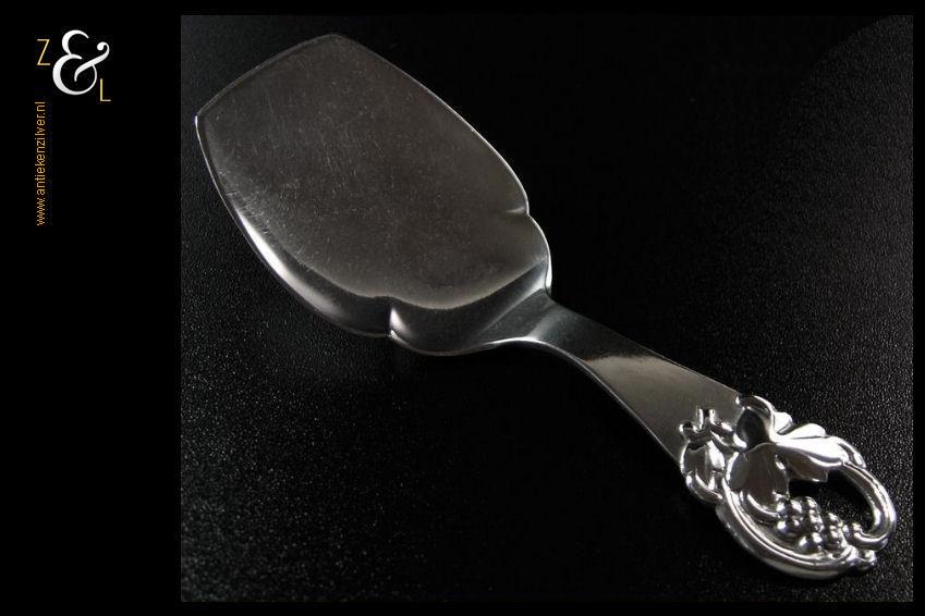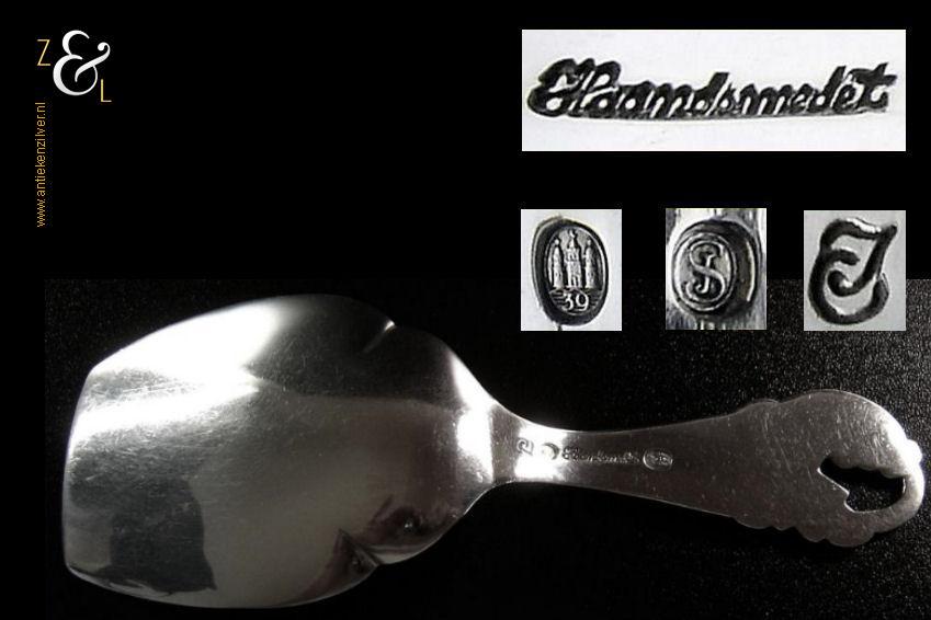Petitfourschep / taartschep gemerkt met het essayeursmerk JS in ovaal van Jens Sigsgaard te Kopenhagen Denemarken werkzaam van 1932 tot 1960, het meesterteken EJ (nog niet gevonden) en het stempel “Haandsmedet” (Handgesmeed). Tevens gestempeld met het zilverkeur drie torens en daaronder het getal 39 duidend op het jaartal 1939 dit is het jaar waarin het stuk gemaakt is. De zilveren petitfour- taartschep weegt 38 gram is 14.1 cm lang en het schepgedeelte meet 7 cm bij 5.1 cm.