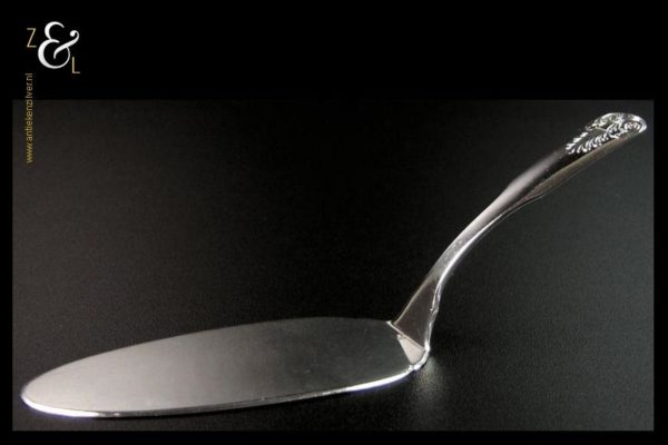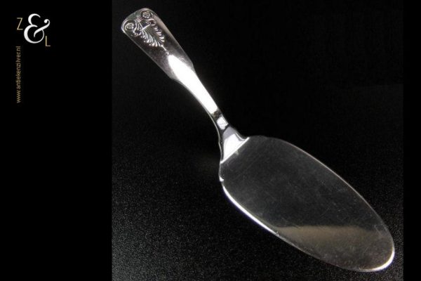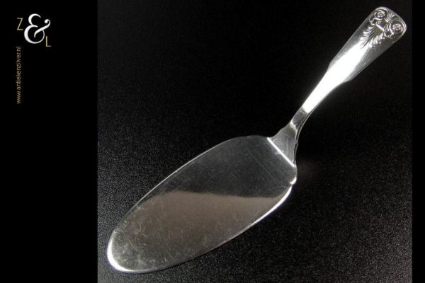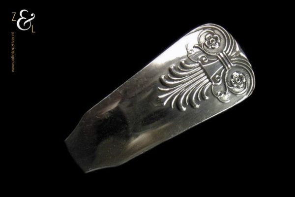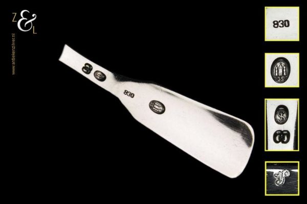 Deze Art Deco petitfourschep / taartschep is gemaakt door Carl M. Cohr te Fredericia Denemarken (meesterteken CM en een gespiegelde C). Tevens gestempeld met het essayeursmerk JS in ovaal dat staat voor essayeur Jens Sigsgaard werkzaam van 1932 tot 1960 en het zilverkeur drie torens met daaronder het getal 35 duidend op het jaartal 1935 dit is het jaar waarin het stuk gemaakt is. De schep is ook gemerkt met het oude Nederlandse belastingstempel V dat van 1906 tot 1953 voor buitenlandse werken gold. De zilveren petitfourschep weegt 39 gram is 15.1 cm lang en het schepgedeelte meet 8.9 cm bij 4.4 cm.