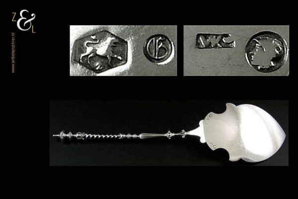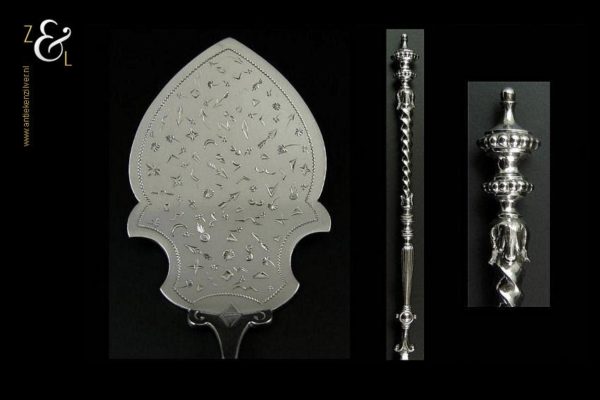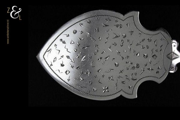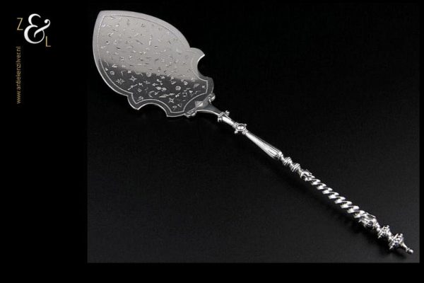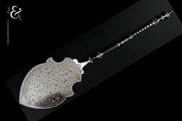 Petitfourschep / taartschep gemaakt in Voorschoten door de Firma J.M. van Kempen & Zonen (meesterteken VK liggend maantje in rechthoek) in het jaar 1891 (jaarletter G). Deze deels gematteerde (matteren is een bewerking waarbij de zilversmid het oppervlak van een zilveren voorwerp een matte structuur geeft) zilveren petitfour- taartschep heeft een gegoten steel met torenknopje en een schepgedeelte gegraveerd met diverse symbolen. De schep weegt 55 gram en is 22 cm lang, het schepgedeelte meet 8.7 cm x 5.5 cm.
