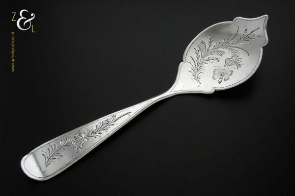 Petitfourschep / taartschep gemaakt in Schoonhoven door Jacob Kooiman (meesterteken JK. boven 1 in vierkant) in het jaar 1888 (jaarletter D). Deze zilveren Jugendstil petitfourschep / taartschep waarvan zowel de steel als het schepgedeelte gematteerd is (matteren is een bewerking waarbij de zilversmid het oppervlak van een zilveren voorwerp een matte structuur geeft) is geheel gegraveerd met bloem- en bladmotieven. Op het schepgedeelte is tevens een gegraveerde vlinder afgebeeld. De petitfourschep / taartschep weegt 50 gram en is 22.3 cm lang. Het schepgedeelte is 9.5 cm lang bij 6 cm breed.
