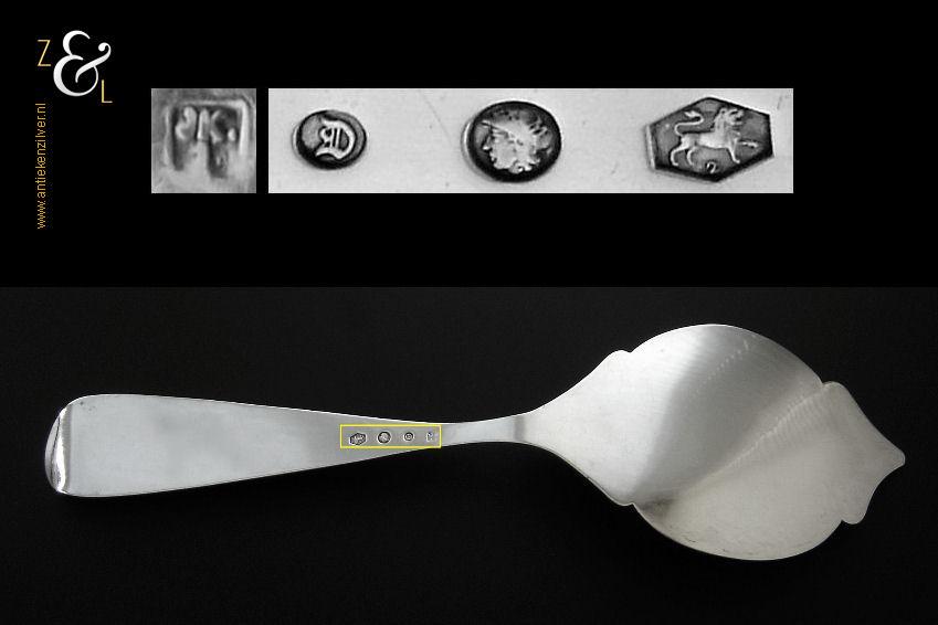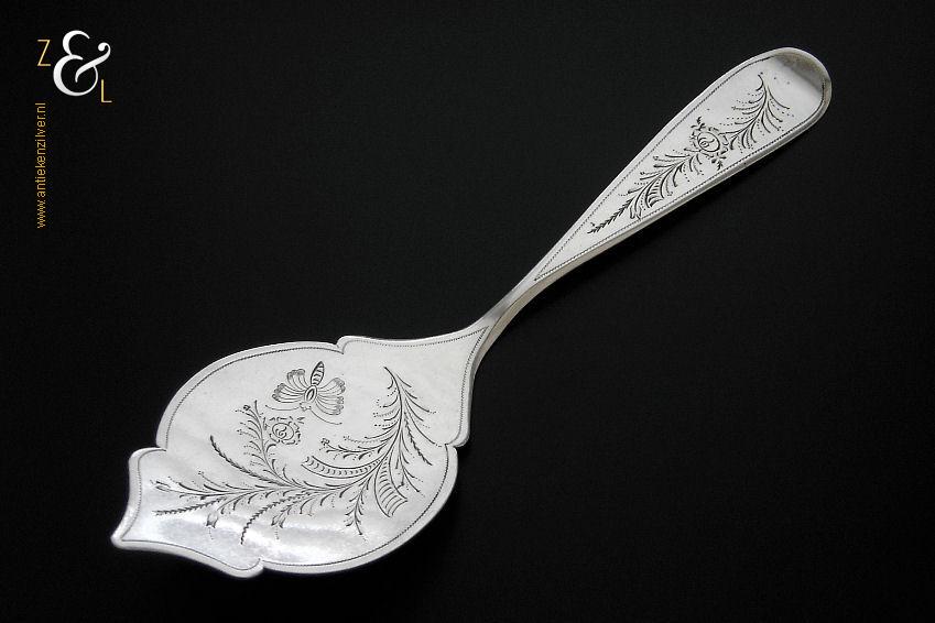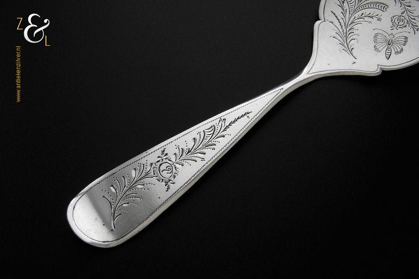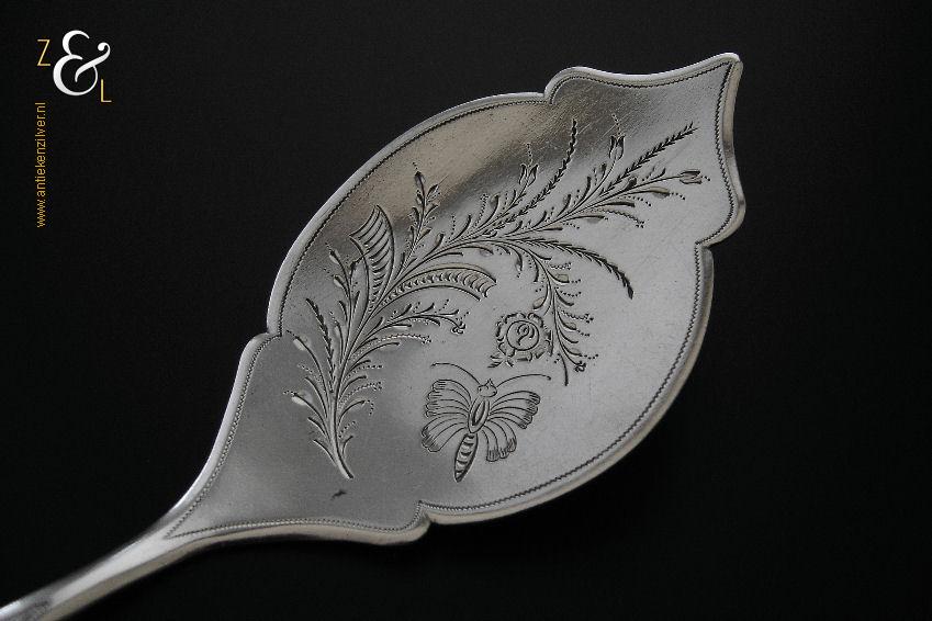 Petitfourschep / taartschep gemaakt in Schoonhoven door Jacob Kooiman (meesterteken JK. boven 1 in vierkant) in het jaar 1888 (jaarletter D). Deze zilveren Jugendstil petitfourschep / taartschep waarvan zowel de steel als het schepgedeelte gematteerd is (matteren is een bewerking waarbij de zilversmid het oppervlak van een zilveren voorwerp een matte structuur geeft) is geheel gegraveerd met bloem- en bladmotieven. Op het schepgedeelte is tevens een gegraveerde vlinder afgebeeld. De petitfourschep / taartschep weegt 50 gram en is 22.3 cm lang. Het schepgedeelte is 9.5 cm lang bij 6 cm breed.