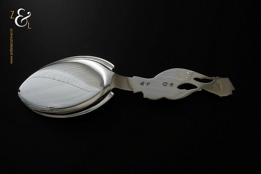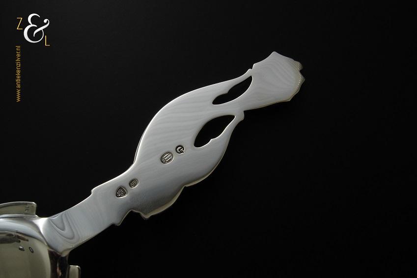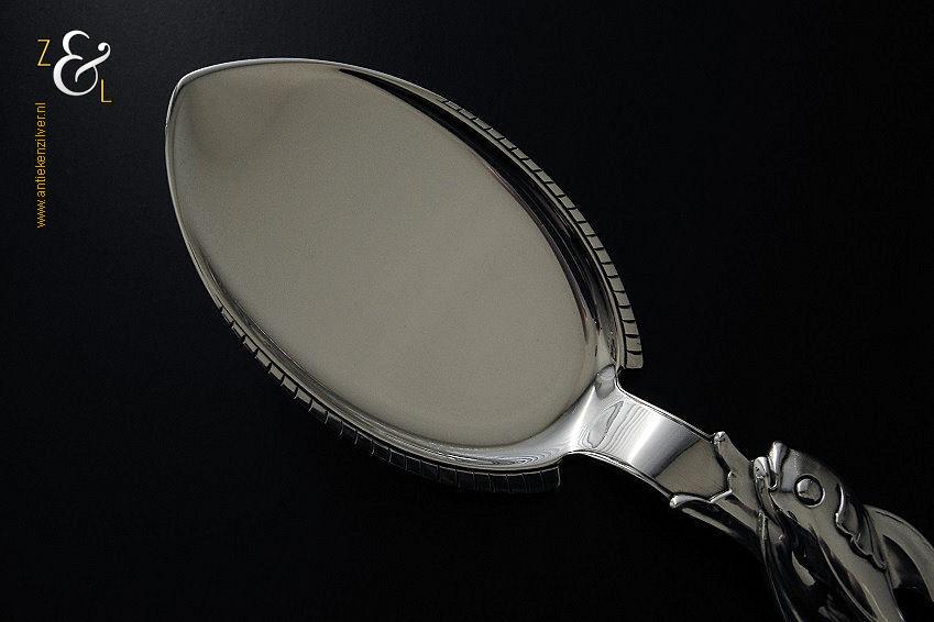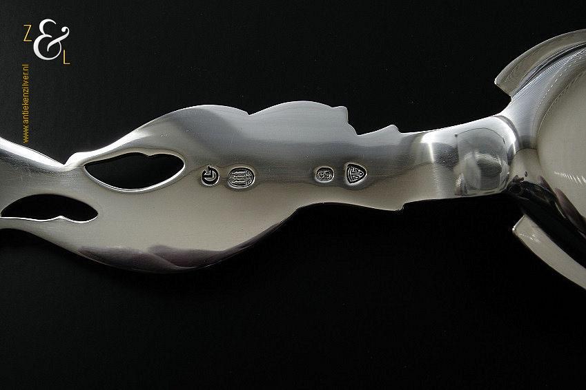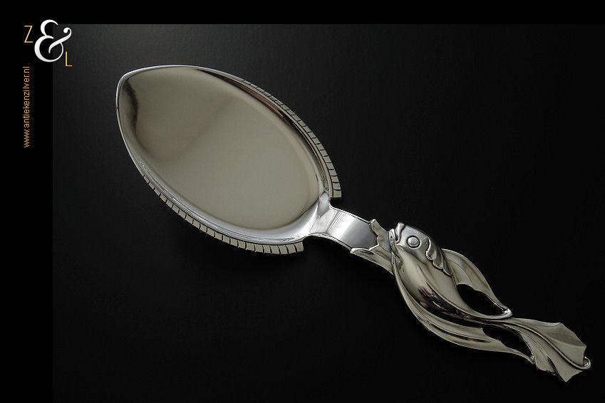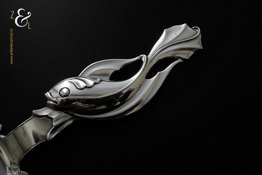 Deze visdienschep / visschep / taartschep is gemaakt bij de Grann & Laglye zilver product fabriek te Kopenhagen Denemarken (meesterteken L in G). Tevens gestempeld met het zilverkeur drie torens en het getal 34 duidend op het jaartal 1934 dit is het jaar waarin de schep gemaakt is, een stempel met het essayeurmerk JS in ovaal dat staat voor essayeur Jens Sigsgaard werkzaam van 1932 tot 1960 en daaronder gestempeld met een keur in schildvorm D Hamer A dit is een merk dat staat voor Dansk Arbedje een Deens keur van de Nationale Vereniging voor Deense Ondernemers, een organisatie die Deense producten promoot bij de Deense consumenten en tevens de aankoop van Deense goederen over de hele wereld aanmoedigt. De prachtige zware zilveren Art Nouveau schep heeft een steel in de vorm van een gestileerde vis hij weegt 65 gram is 18 cm lang en de schep meet 5.3 cm breed bij 8.5 cm lang.
