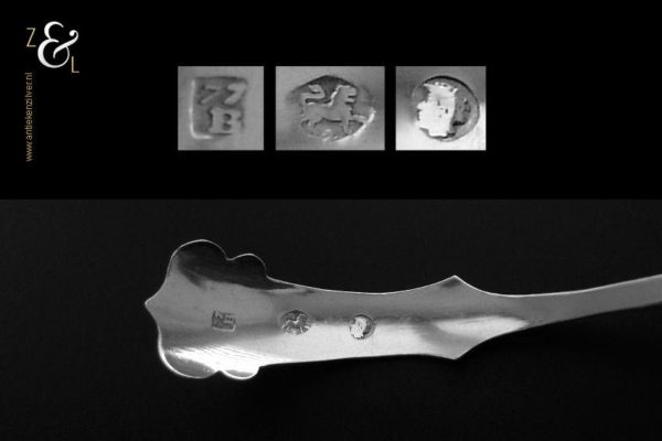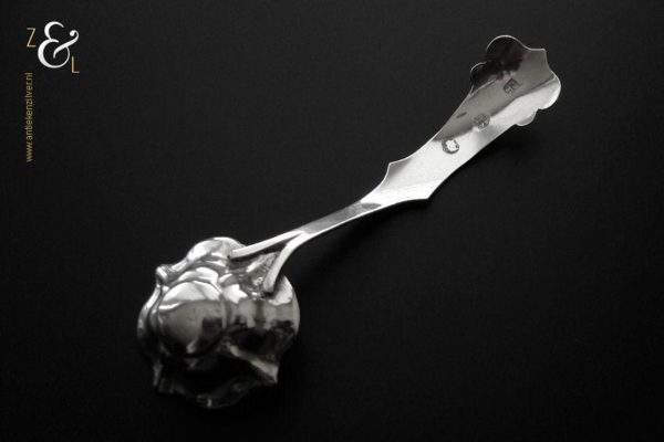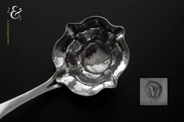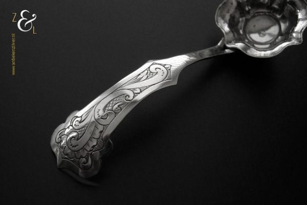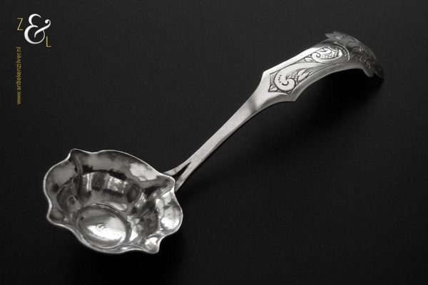 Specerijschepje gemaakt in Joure Friesland door Christiaan Jacob Bruinings of Brunings (meesterteken 77 boven B in vierkant) in het jaar 1855 (jaarletter V). Het zilveren specerijschepje heeft een bakje in accoladevorm en een apart gevormd handvat gegraveerd met c-vormige voluten. Het specerijschepje weegt 5 gram is 8.5 cm lang en het bakje heeft een diameter van 2.7 cm.