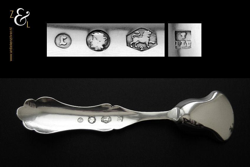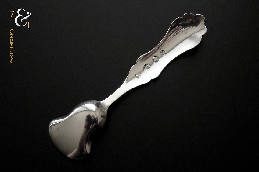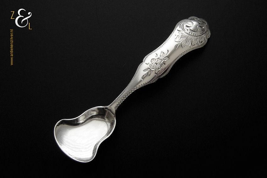 Specerijschepje gemaakt in Amsterdam door Theodorus Lambertus Uriot (meesterteken aambeeld boven FLU in vierkant) in het jaar 1862 (jaarletter C). Het zilveren specerijschepje heeft een bakje in de vorm van een schep en het handvat is gegraveerd met c-vormige voluten en een bloemmotief. Het specerijschepje weegt 5 gram is 8.2 cm lang en het bakje is 2.4 cm lang bij 2.1 cm breed.