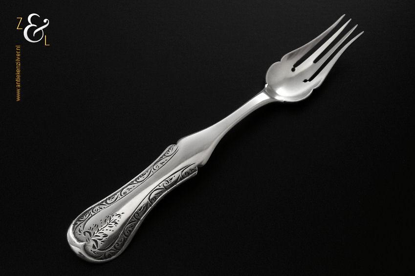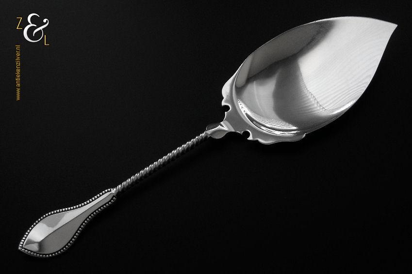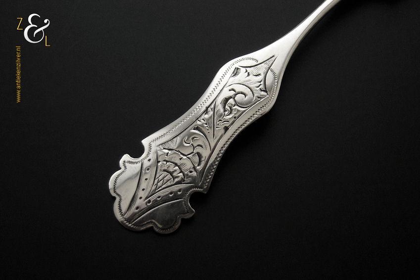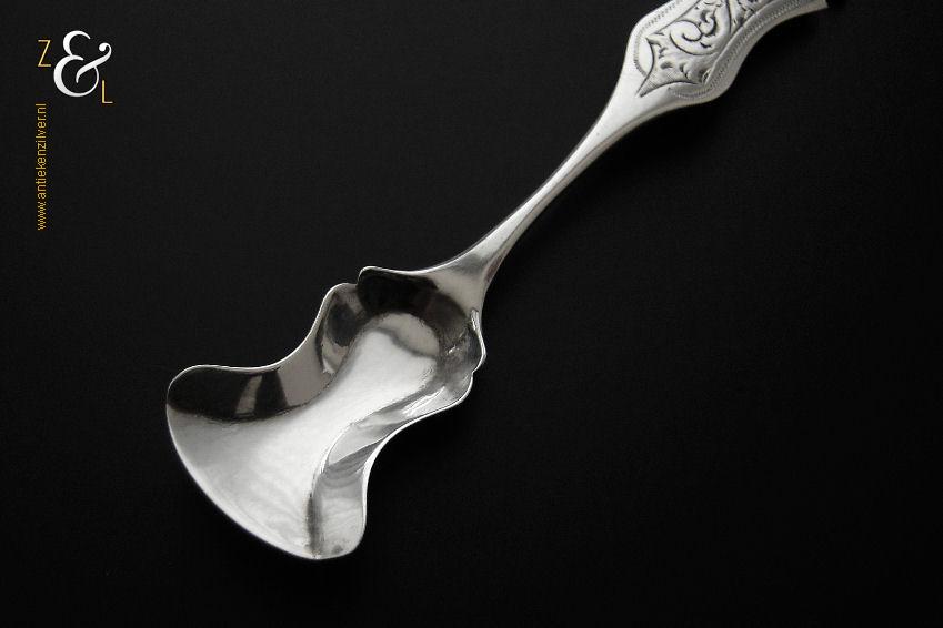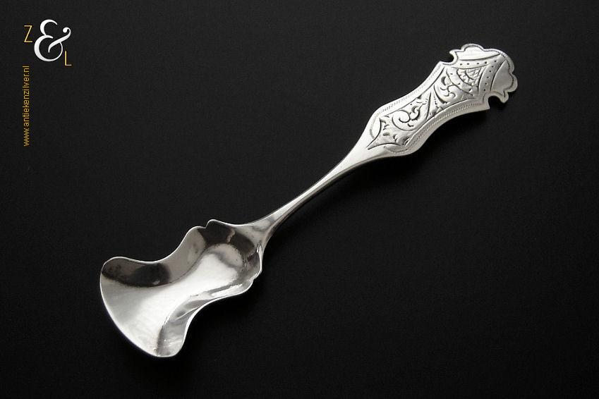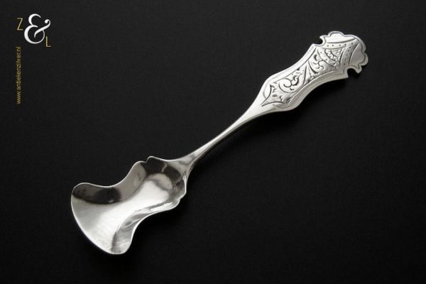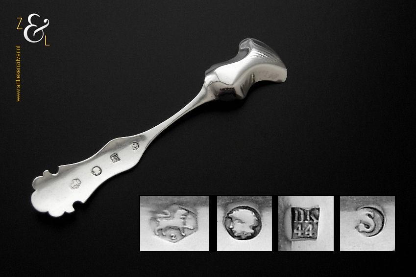 Specerijschepje gemaakt in Den Bosch / ‘s-Hertogenbosch door Antonius Hendrikus der Kinderen (meesterteken DK boven 44 in vierkant) in het jaar 1852 (jaarletter S). Het zilveren specerijschepje heeft een bakje in de vorm van een schep en het apart gevormde handvat is gegraveerd met c-vormige voluten. Het specerijschepje weegt 6 gram is 9.1 cm lang en het bakje is 2.9 cm lang bij 2 cm breed.