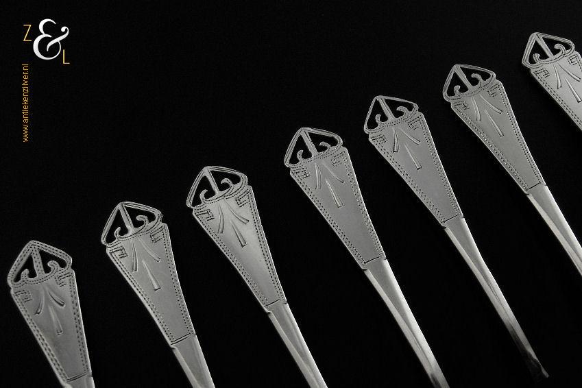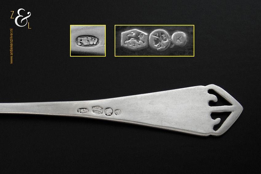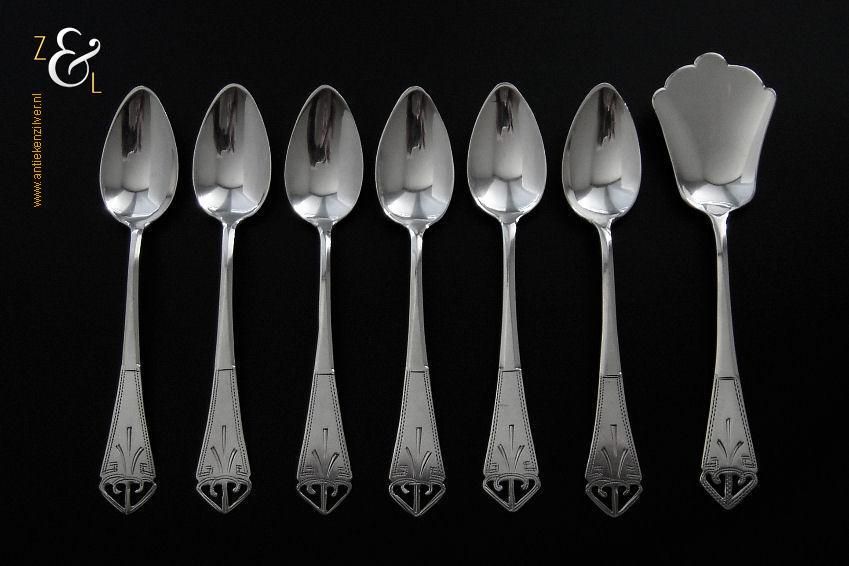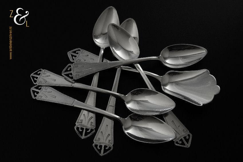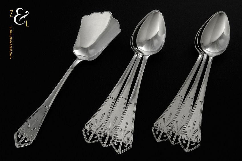 Deze 6 koffielepels / theelepels met bijpassende suikerschep zijn gemaakt in Schoonhoven bij de Firma de Pleijt & de Wilde (meesterteken P&W in ovaal) in het jaar 1920 (jaarletter K). De zilveren Art Deco koffielepels / theelepels en suikerschep waarvan het uiteinde van de stelen fijntjes uitgezaagd en gegraveerd zijn wegen 64 gram. De lepels zijn 11.1 cm lang en de suikerschep is 11.9 cm lang.