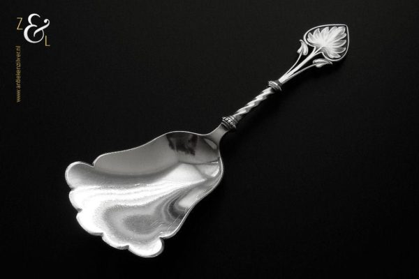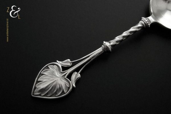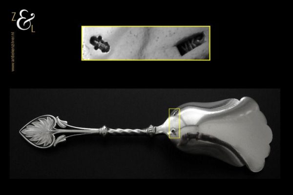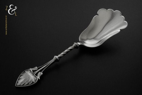 Suikerschep gemaakt in Voorschoten door de Firma J.M. van Kempen & Zonen (meesterteken VK liggend maantje in rechthoek) tussen 1858 en 1905 (gekeurd met het zilverkeur zwaardje). Deze zilveren Art Nouveau suikerschep heeft een geschulpte bak, getordeerde steel en een handvat in de vorm van een gestileerd blad. De suikerschep weegt 15 gram en is 10.5 cm lang.