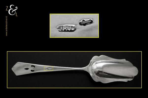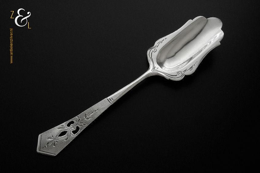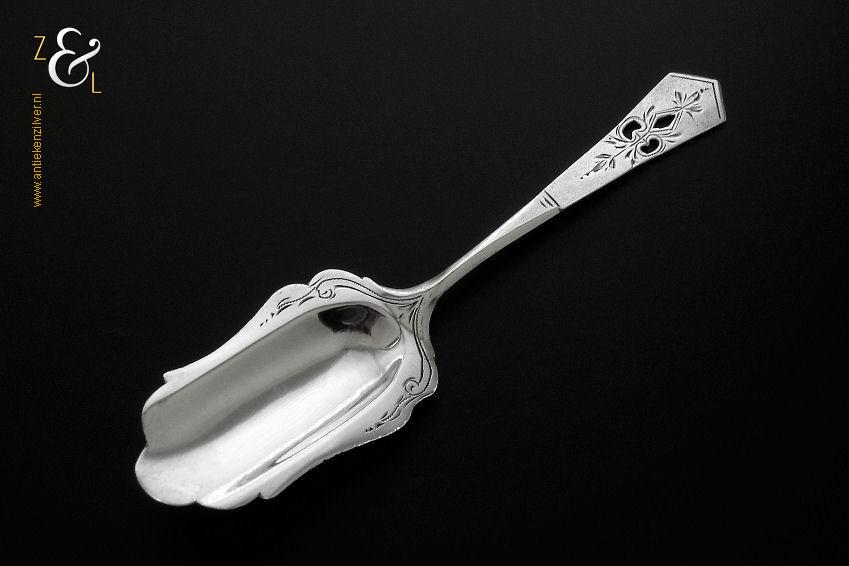 Suikerschep gemaakt in Schoonhoven door J.P. Verkerk (meesterteken JP.V* in zeshoek) tussen 1931 en 1941 (gekeurd met het zilverkeur zwaardje). Deze zilveren suikerschep heeft een sierlijke gravering en een uitgezaagd handvat. De suikerschep weegt 10 gram en is 12.2 cm lang.