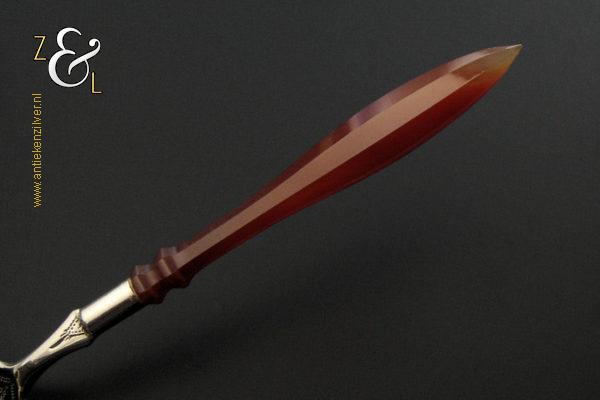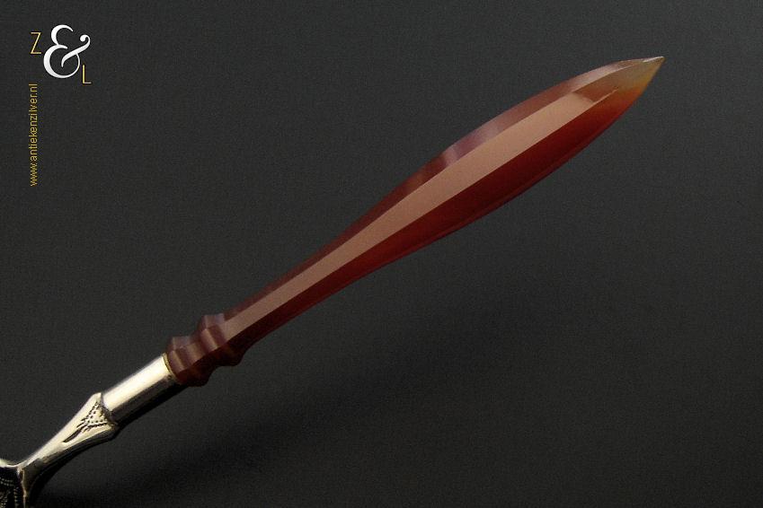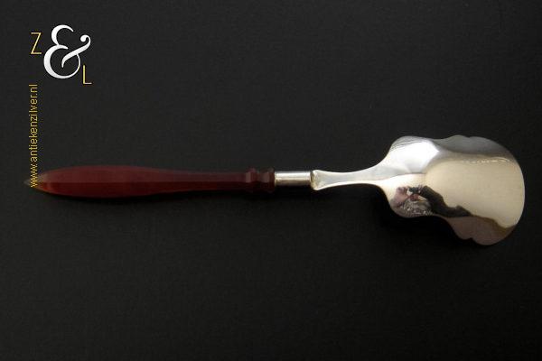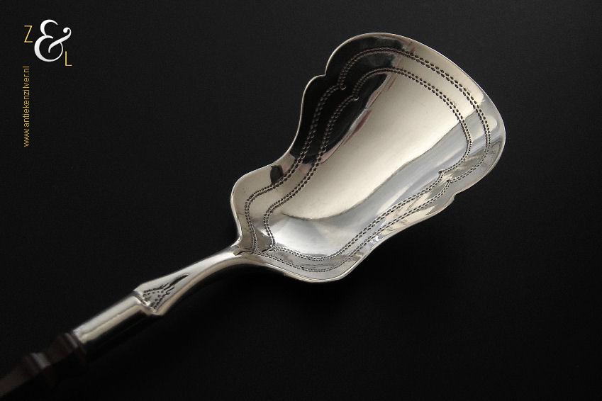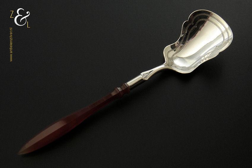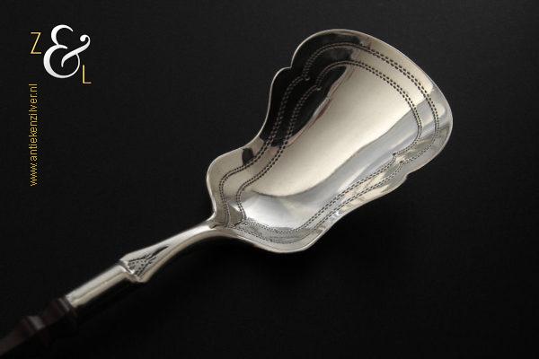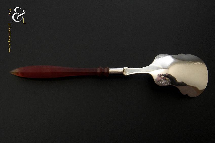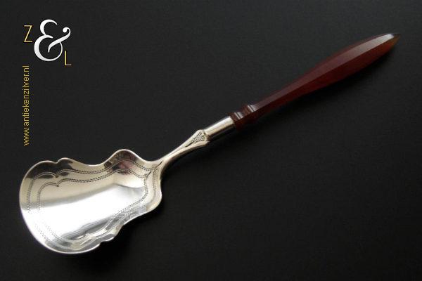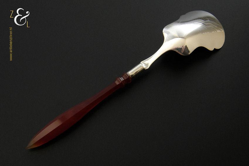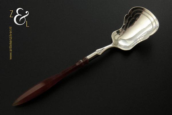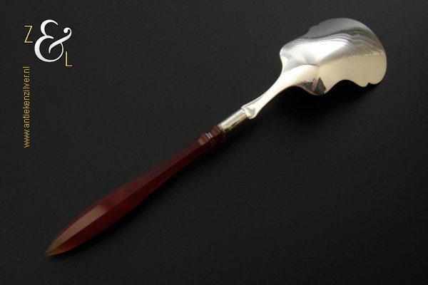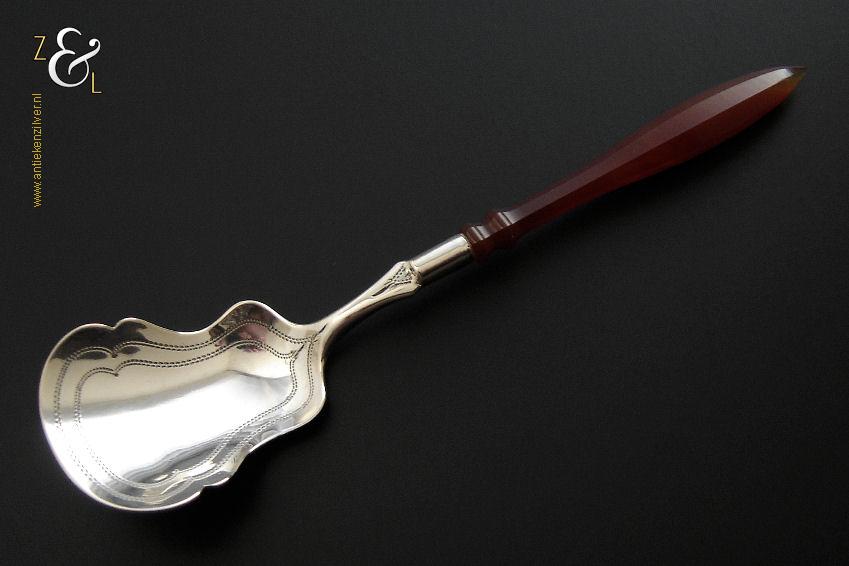 Deze suikerschep die uit de tweede helft van de 19e eeuw stamt is vermoedelijk in Schoonhoven of Amsterdam (waar dit model toen populair was) gemaakt. De zilveren in Biedermeier stijl uitgevoerde suikerschep die geen keuren draagt heeft een achtkantig geslepen agaten handvat die uitloopt in een punt. De stevige suikerschep die tegenwoordig nog steeds goed bruikbaar is weegt 16 gram en is 14.5 cm lang. Het fijntjes gegraveerde schepgedeelte is 4.5 cm lang bij 3.2 cm breed.