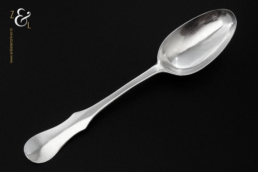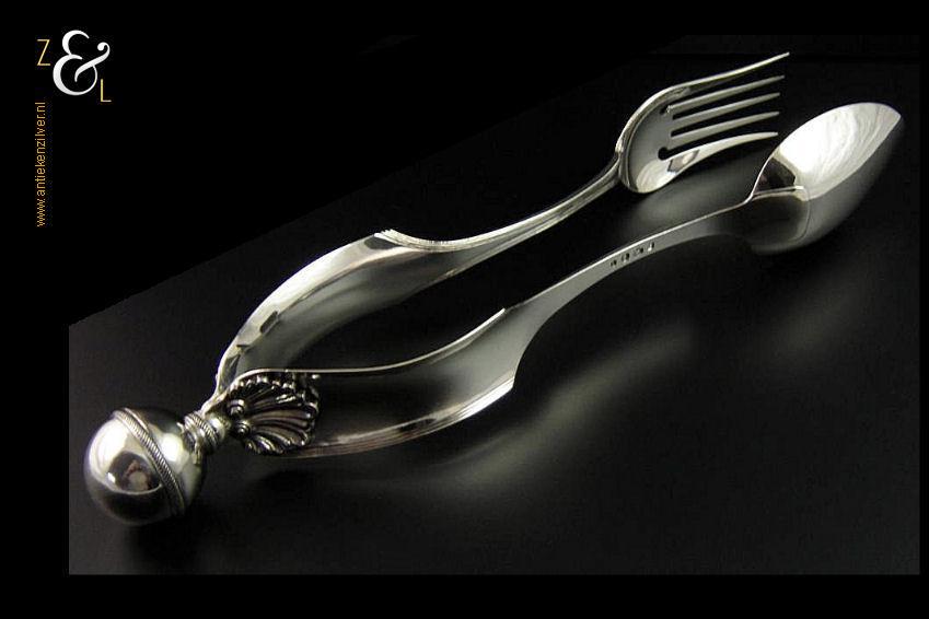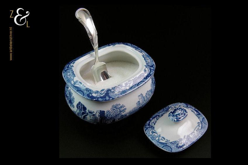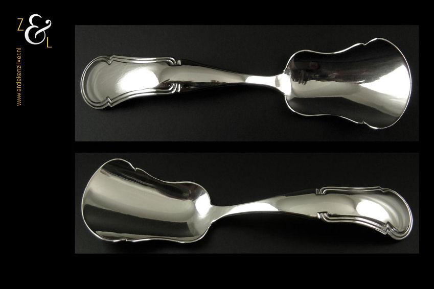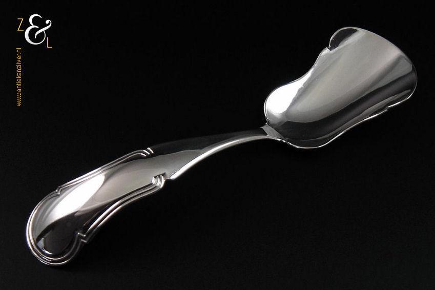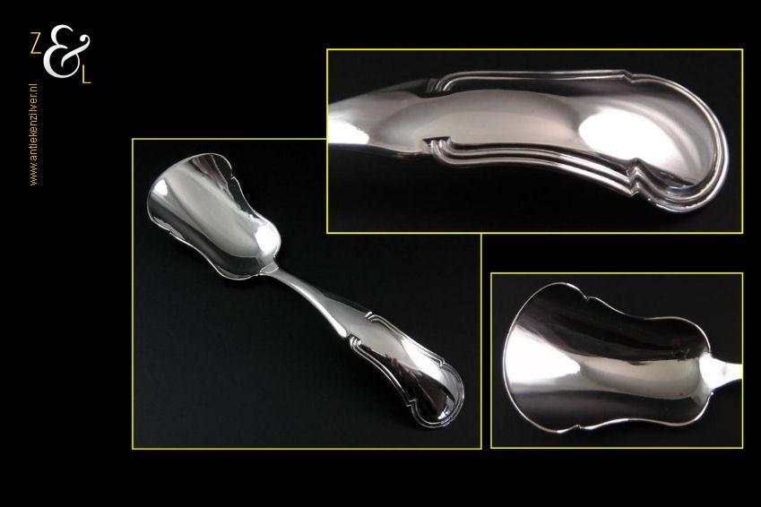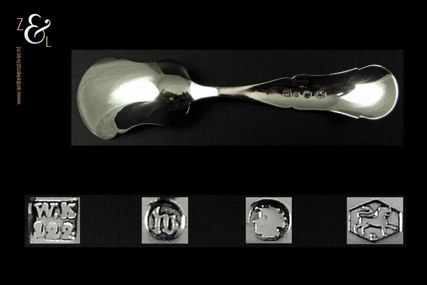 Suikerschep gemaakt in Schoonhoven door Willem Kooiman (meesterteken W.K boven 122 in vierkant) in het jaar 1881 (jaarletter W). Deze in dubbelrondfilet uitgevoerde zilveren suikerschep weegt 12 gram en is 11.1 cm lang. De suikerpot dient ter decoratie.