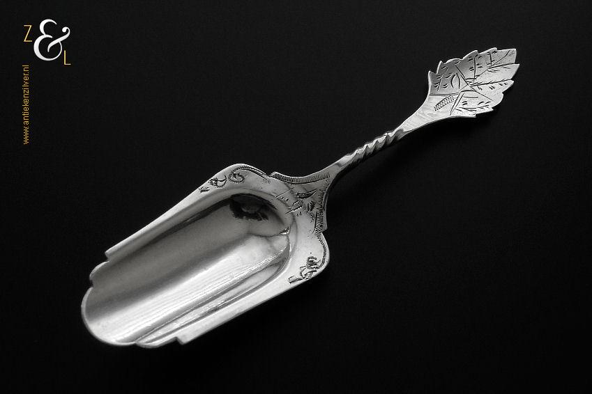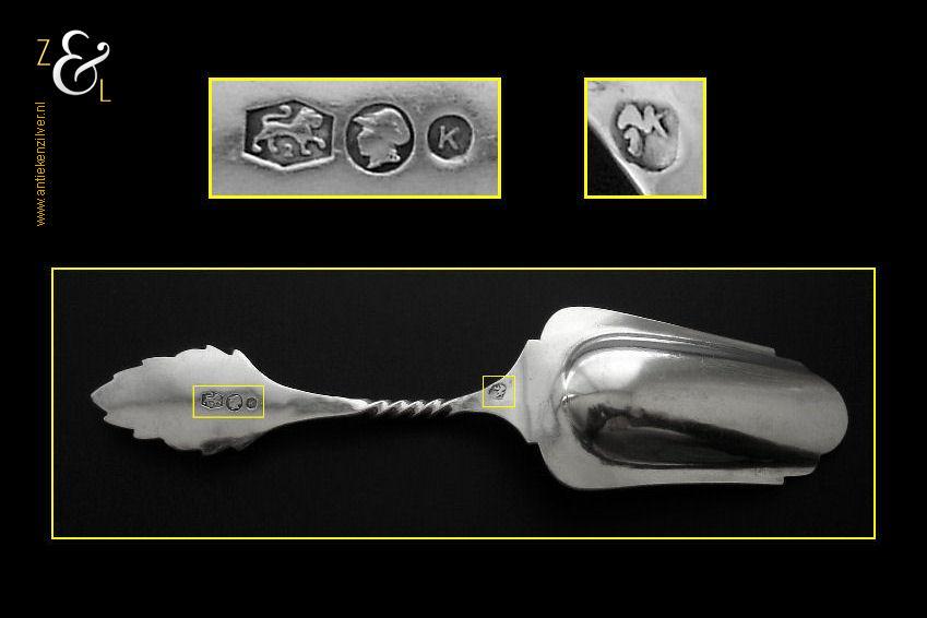 Theeschep / theeduim gemaakt in Schoonhoven door Andries Cornelis Jz. Kooiman (meesterteken AK boven 1 in achthoek) in het jaar 1920 (jaarletter K). Deze zilveren Art Deco theeschep / theeduim heeft een getordeerde steel en een gegraveerd bladvormig handvat. De theeschep / theeduim weegt 9 gram en is 10.5 cm lang.