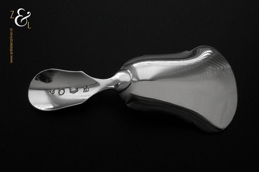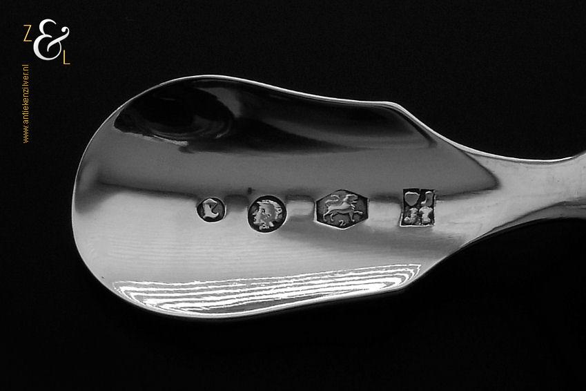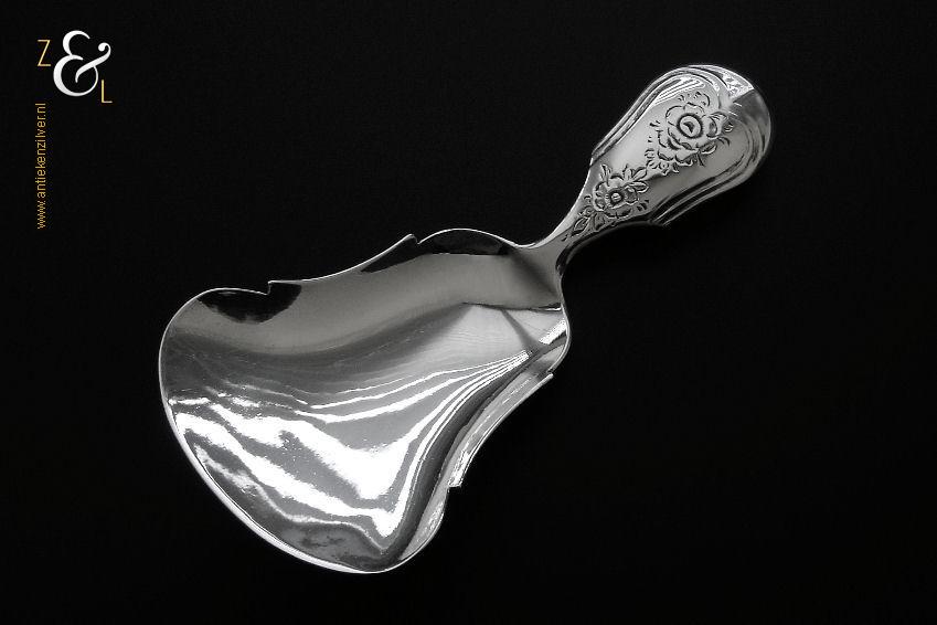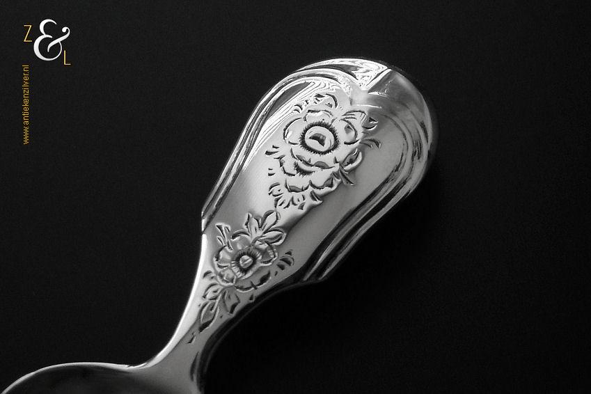 Theeschep / theeduim gemaakt in Amsterdam door Johannes Jacobus Torlau (meesterteken hartje J boven J T in vierkant) in het jaar 1864 (jaarletter E). De zilveren Biedermeier stijl theeschep / theeduim is uitgevoerd in model hartfilet en heeft een gravering van bloemmotieven op het handvat. De theeschep / theeduim weegt 13 gram en is 8.8 cm lang