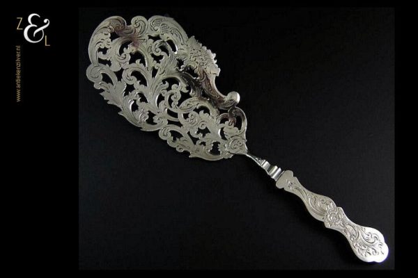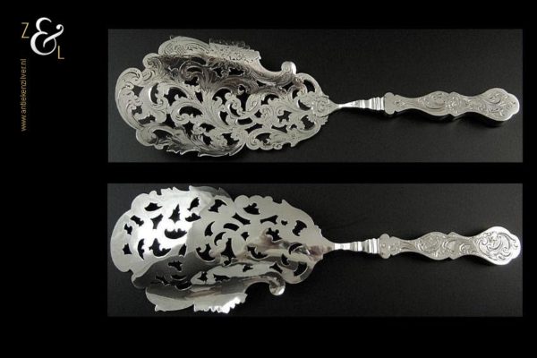De zilversmeden uit de Biedermeier tijd konden al hun vakmanschap zoals, drijven, zagen, graveren, gieten, solderen etc. kwijt bij het maken van het schepwerk, deze visdienschep is daar een goed voorbeeld van.