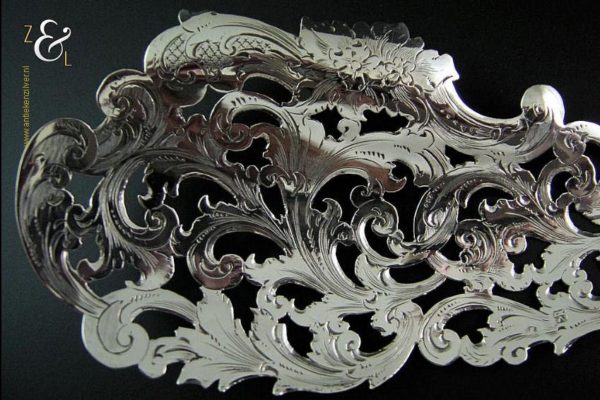 Visdienschep / visschep gemaakt in Rotterdam door de Firma Lang & Koops (Jacob Lang & Christiaan Koops) (meesterteken L&K boven passer in vierkant) in het jaar 1853 (jaarletter T). Deze geheel op de hand gemaakte zilveren Biedermeier visdienschep / visschep is met c-vormige voluten gegraveerd, weegt 101 gram en is 28.8 cm lang, de schep meet 15.1 cm bij 8.9 cm. De visdienschep / visschep heeft aan de achterzijde van de schep twee héél kleine scheurtjes die niet door en door zijn (zie afbeelding met rood omlijnde detailfoto linksboven).