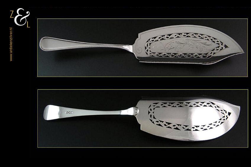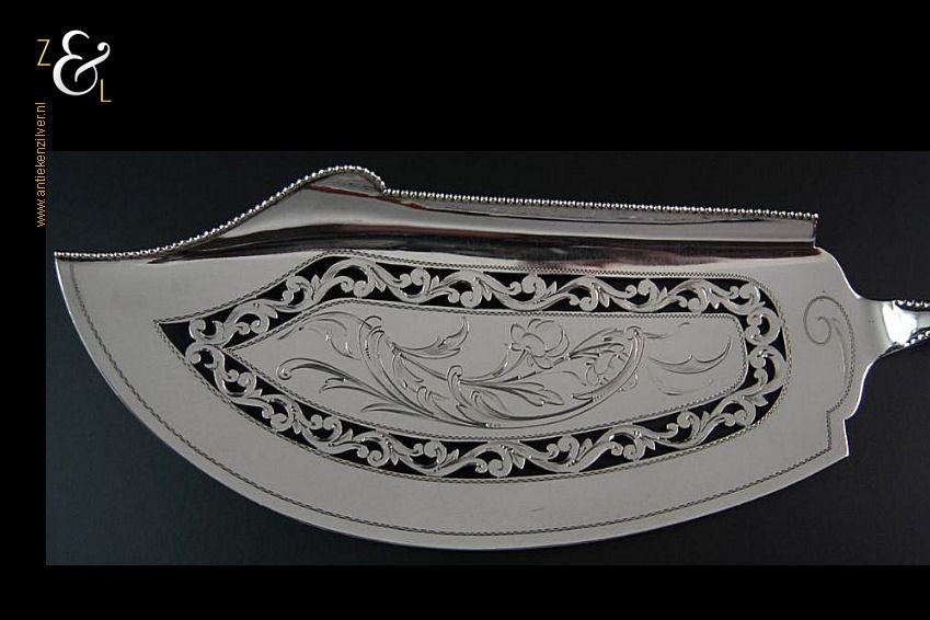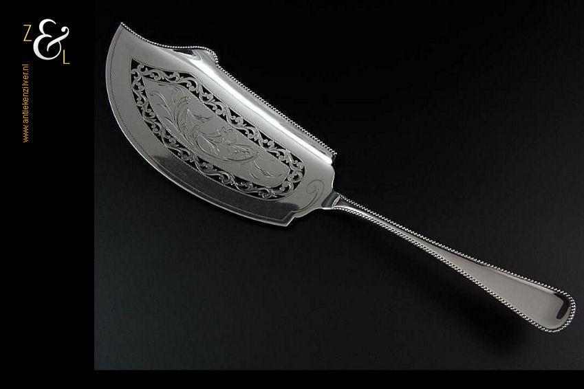 Van deze met parelrand uitgevoerde zilveren Jugendstil visdienschep / visschep is het gematteerde middenstuk (matteren is een bewerking waarbij de zilversmid het oppervlak van een zilveren voorwerp een matte structuur geeft) elegant gegraveerd en fijntjes uitgezaagd. De schep weegt 119 gram is 30.7 cm lang en het schepgedeelte meet 7.4 cm bij 17 cm.