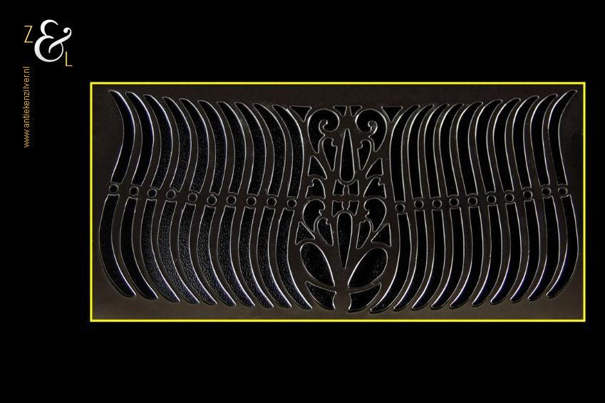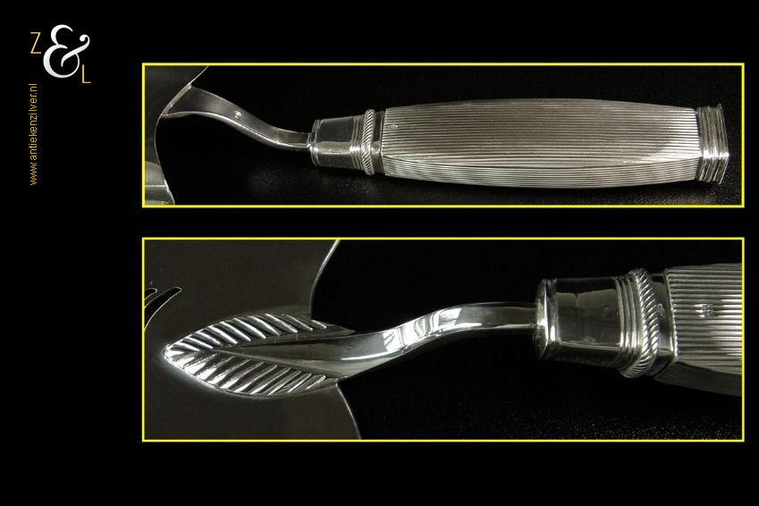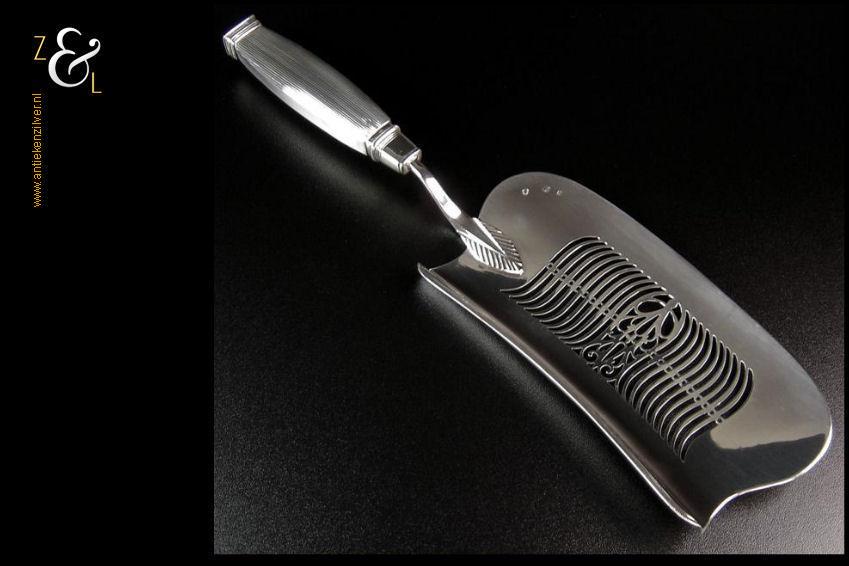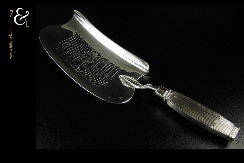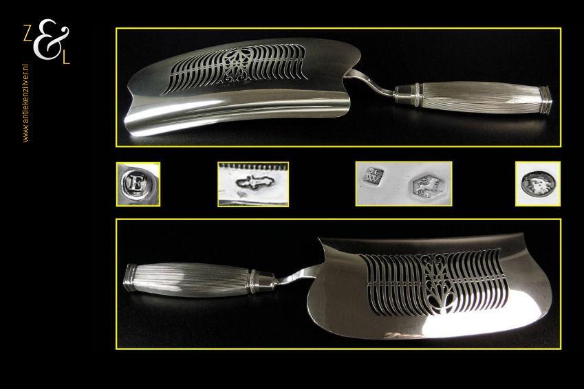 Visdienschep / visschep gemaakt in Amsterdam door Willem Willems (meesterteken 96 boven .WW. in vierkant) in het jaar 1839 (jaarletter E). Deze gezaagde en met een ribhandvat uitgevoerde antieke zilveren Biedermeier visdienschep / visschep weegt 157 gram is 32.7 cm lang, het schepgedeelte meet 8.5 cm bij 18.6 cm.