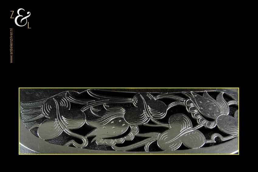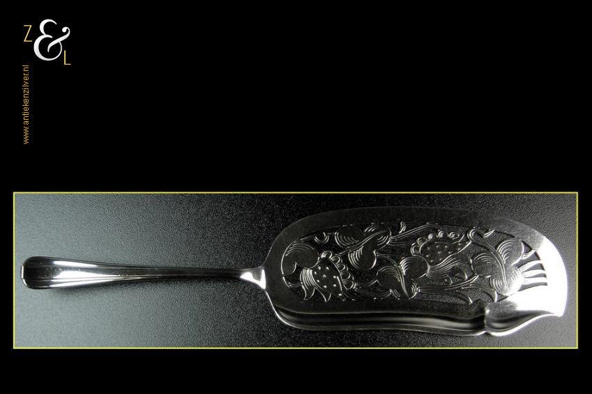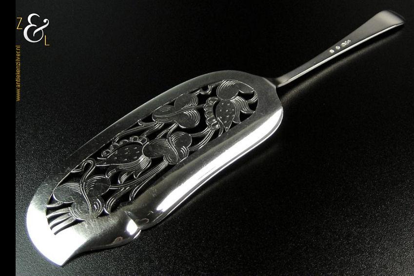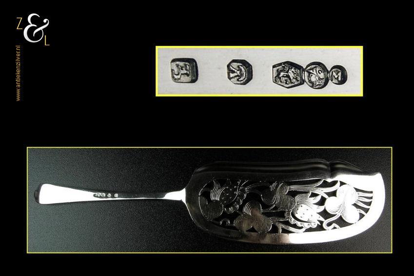 Deze visdienschep / visschep ontworpen door Christa Ehrlich (deze lepel draagt tevens haar eigen meesterteken CE in een vierkant) is gemaakt in Voorschoten door de Zilverfabriek Voorschoten N.V. (meesterteken V boven liggend maantje in achthoek) in het jaar 1947 (jaarletter M). Deze ajour en aan twee zijden gegraveerde zware en in model 1064 uitgevoerde zilveren visdienschep / visschep weegt 106 gram en is 27 cm lang. Het schepgedeelte is 15 cm lang en 6.3 cm breed.