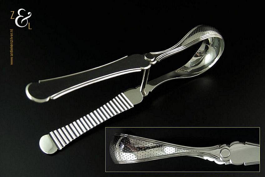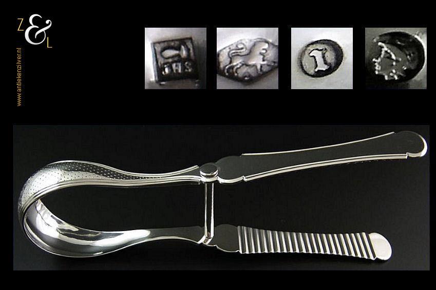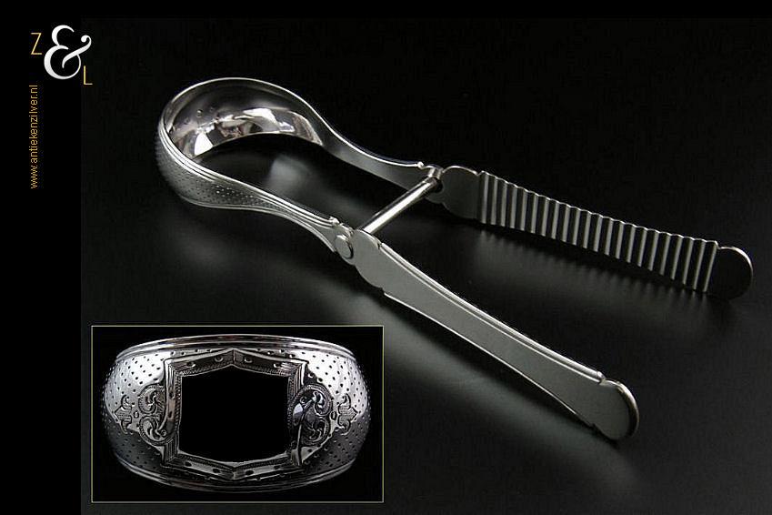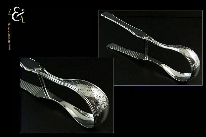 Aspergetang gemaakt in Amsterdam door Jacob Hendrik Schouten (meesterteken hamer boven JHS in vierkant) in het jaar 1868 (jaarletter I). Deze zware met stippelgravure en filetrand uitgevoerde zilveren aspergetang weegt 156 gram en is 23.4 cm lang. Op de kop van de tang is in het cartouche nog plaats voor een monogram.