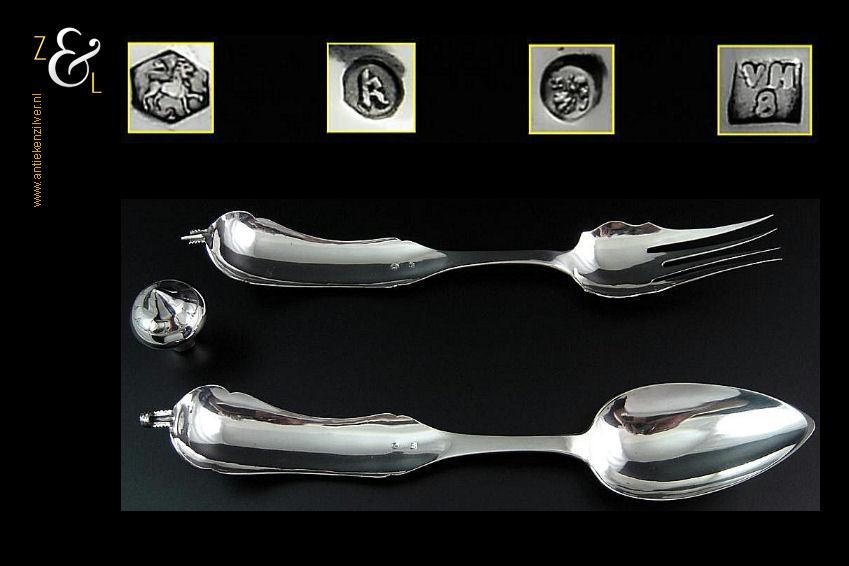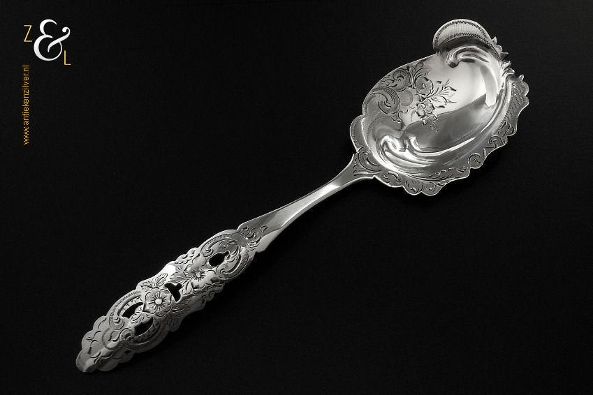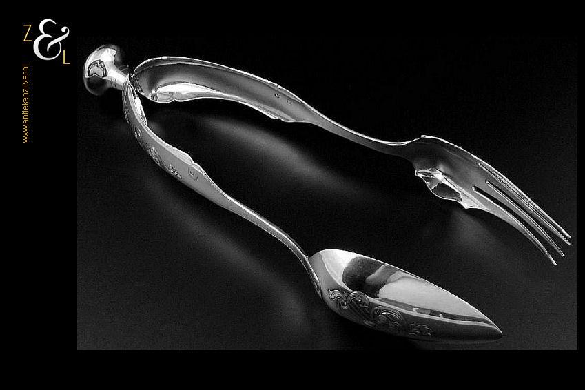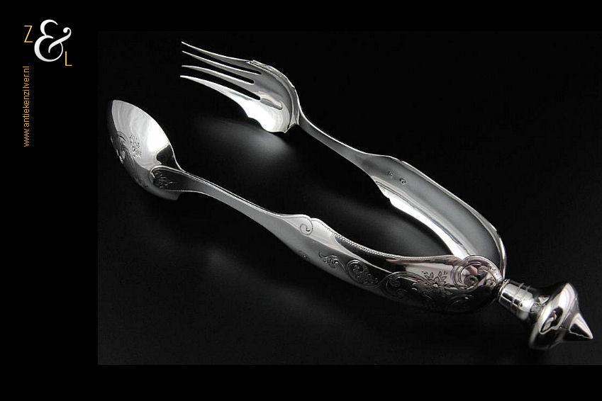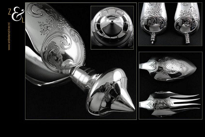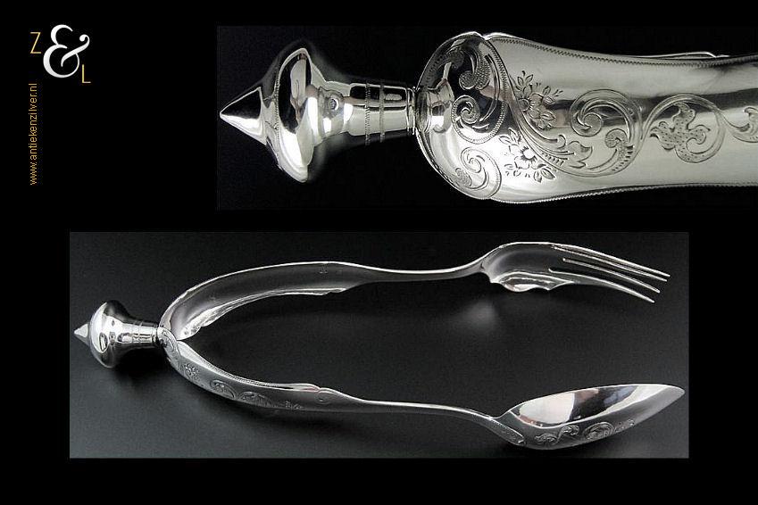 Sladientang / saladetang / slatang gemaakt in Utrecht door Petrus van Harderwijk / Hermanus Josephus van Harderwijk (meesterteken VH boven 8 in vierkant) in het jaar 1869 (jaarletter K). De in Neostijl uitgevoerde zilveren sladientang / saladetang / slatang heeft een schroefknop (gekeurd met het jaarletter K) en is uitneembaar tot twee afzonderlijke delen. De sladientang / saladetang / slatang waarvan de knop, lepel en vork diep gegraveerd zijn met bloemmotieven, rocailles en c-vormige voluten weegt 166 gram en is 30 cm lang.