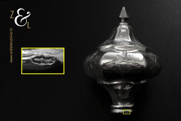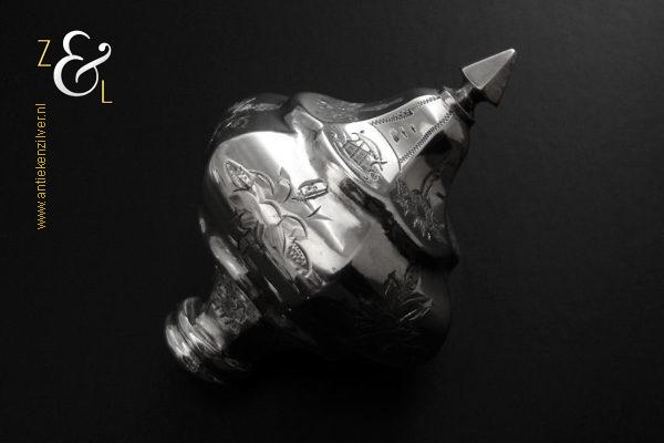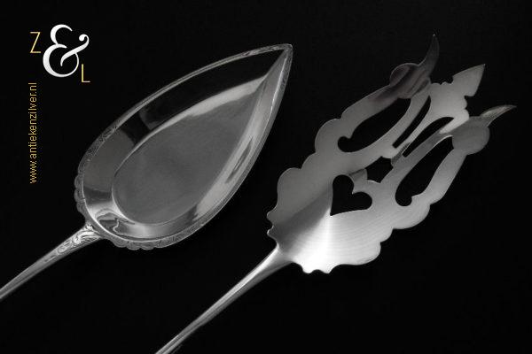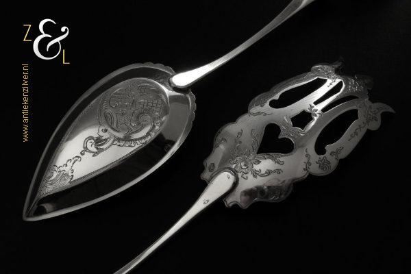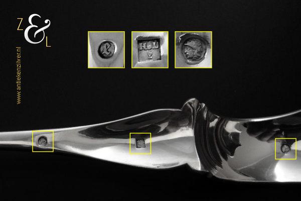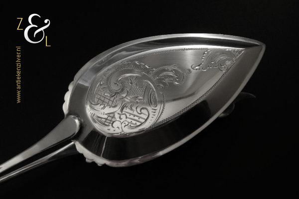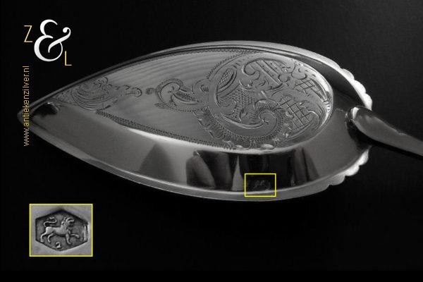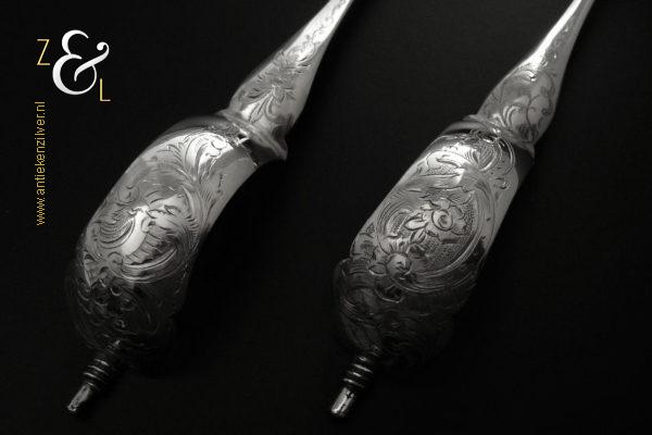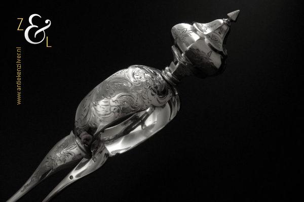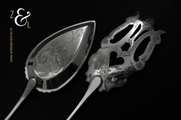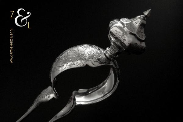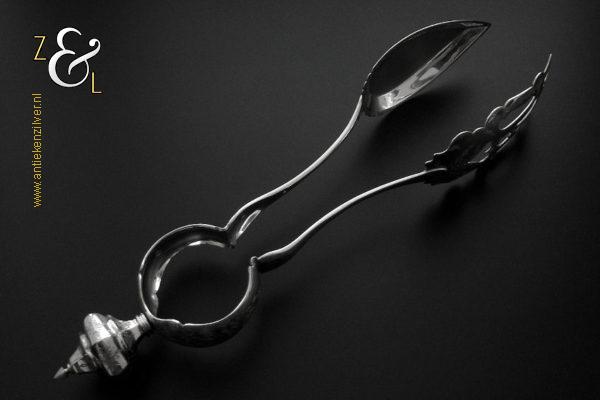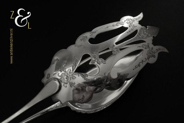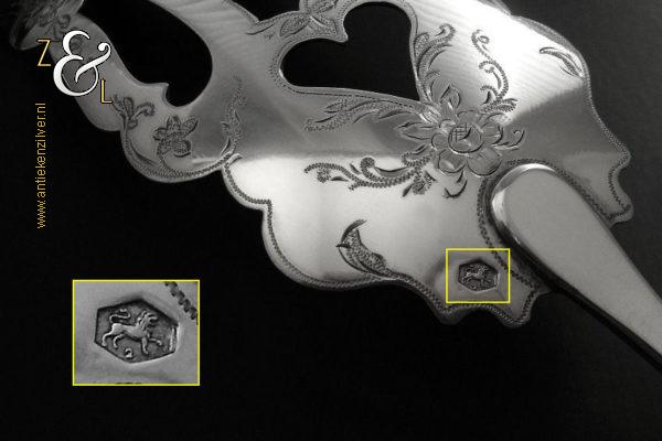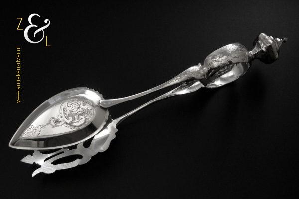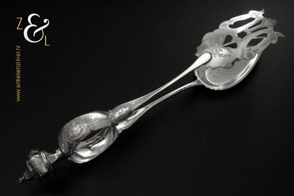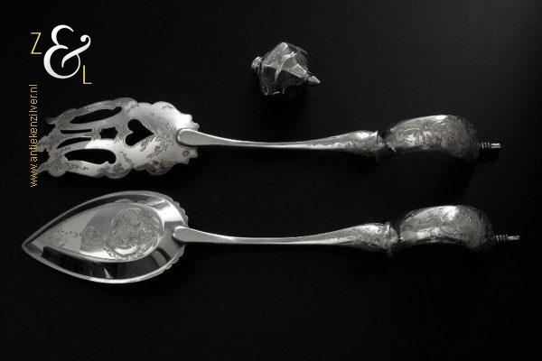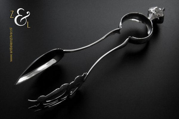 Sladientang / saladetang / slatang gemaakt in Den Bosch / ‘s-Hertogenbosch door Hendrikus Simon de Leeuw (meesterteken HdL boven glas in vierkant) in het jaar 1864 (jaarletter E). De knop is gekeurd met het zilverkeur zwaardje (dit is het gehaltemerk voor kleine zilveren werken). De prachtig gevormde zilveren sladientang / saladetang / slatang heeft een schroefknop en is uitneembaar tot twee afzonderlijke delen. De sladientang / saladetang / slatang waarvan de knop, lepel en vork diep gegraveerd zijn met c-vormige voluten, bloem- en bladmotieven heeft tevens een apart gevormde lepelbak en uitgezaagde vork met een hartmotief. De sladientang / saladetang / slatang weegt 172 gram en is 31.6 cm lang.