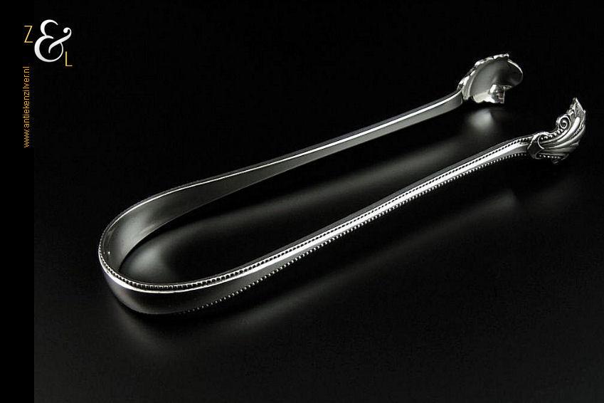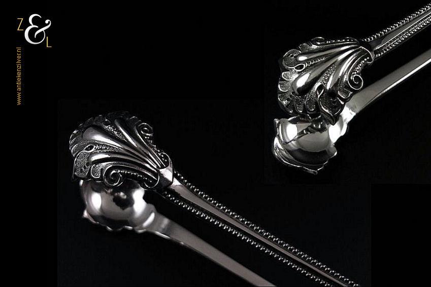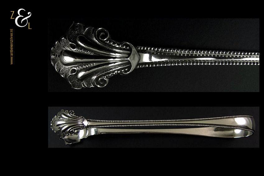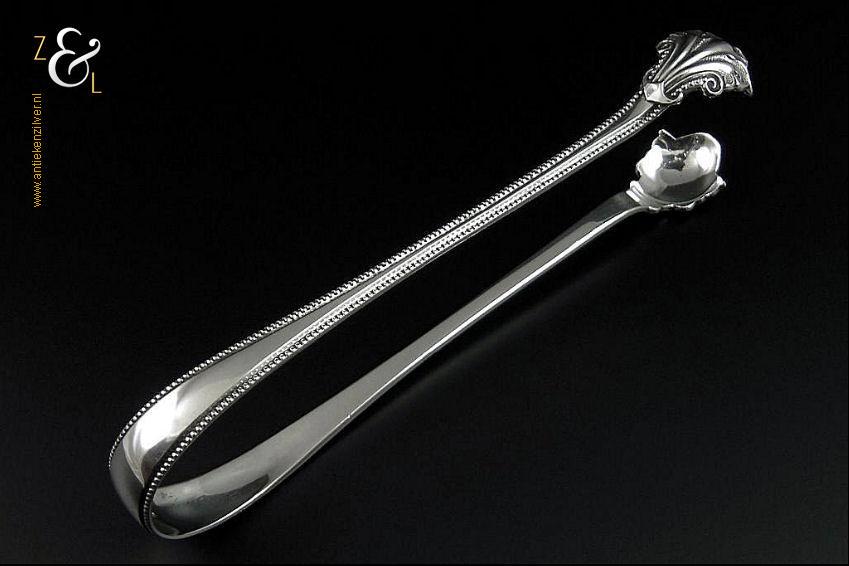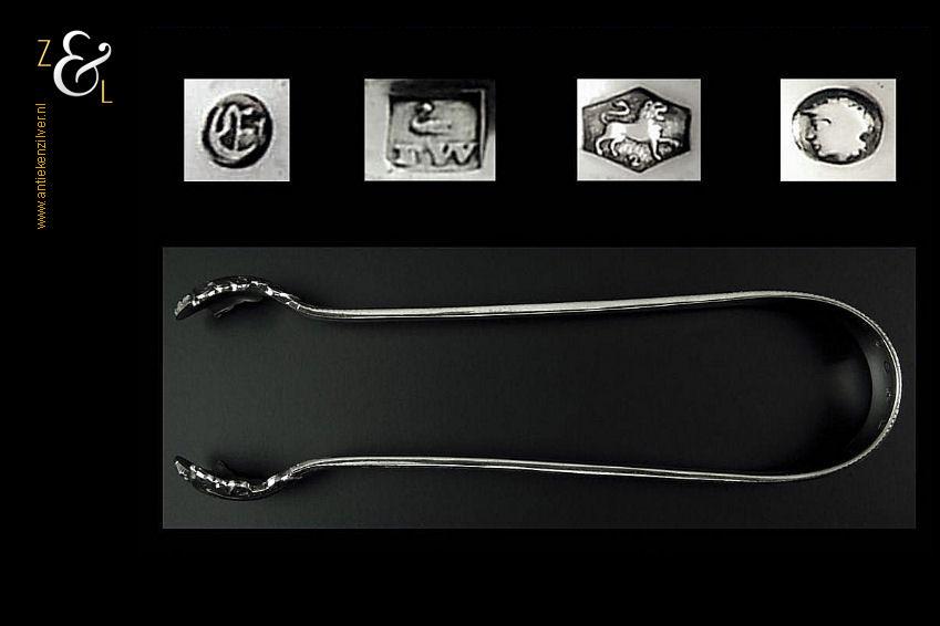 Deze suikerklontjestang / ijsklontjestang is gemaakt in Amsterdam door Ferdinand Woortman (meesterteken FW onder een zwaantje in vierkant) in het jaar 1889 (jaarletter E). Deze zware zilveren Jugendstil tang, van hoge kwaliteit, is uitgevoerd met een parelrand weegt 74 gram en is 17.2 cm lang.